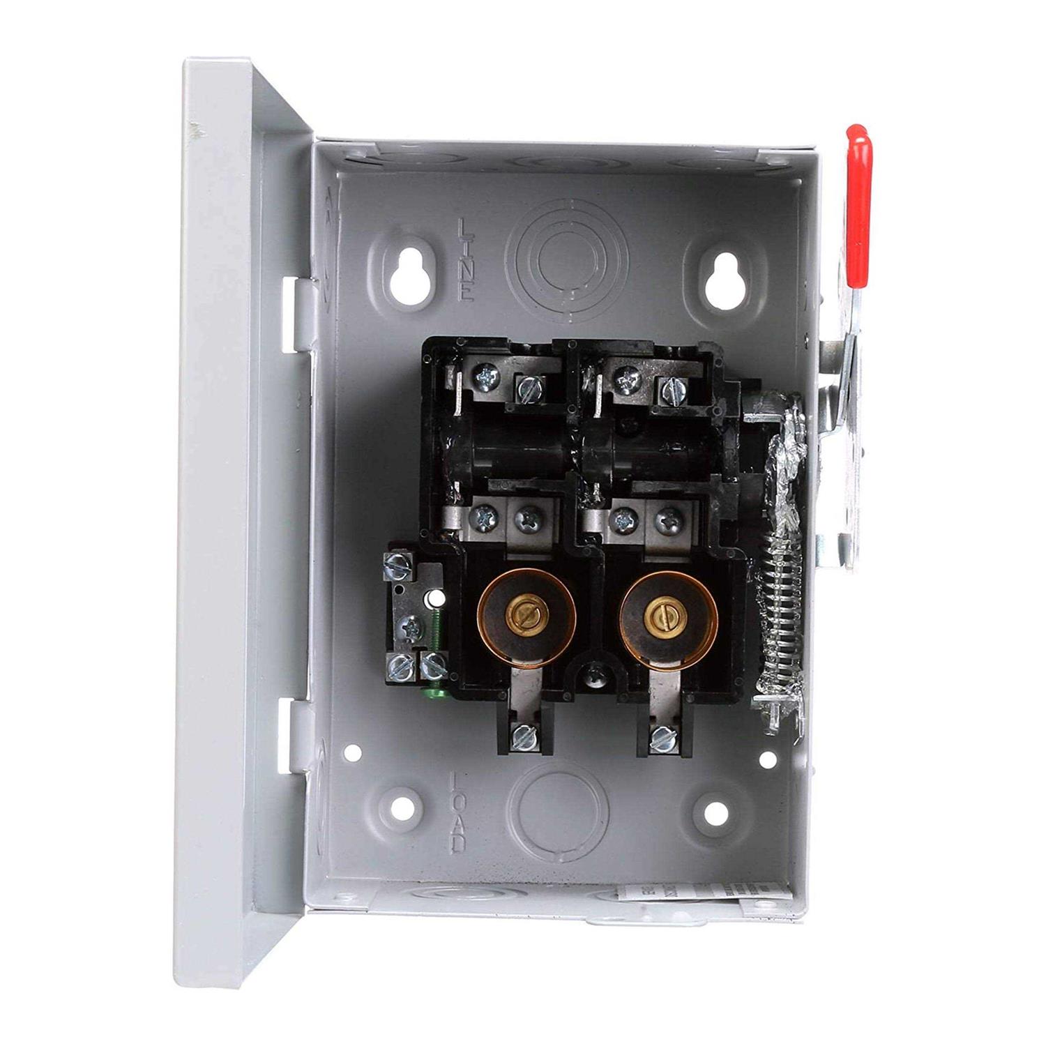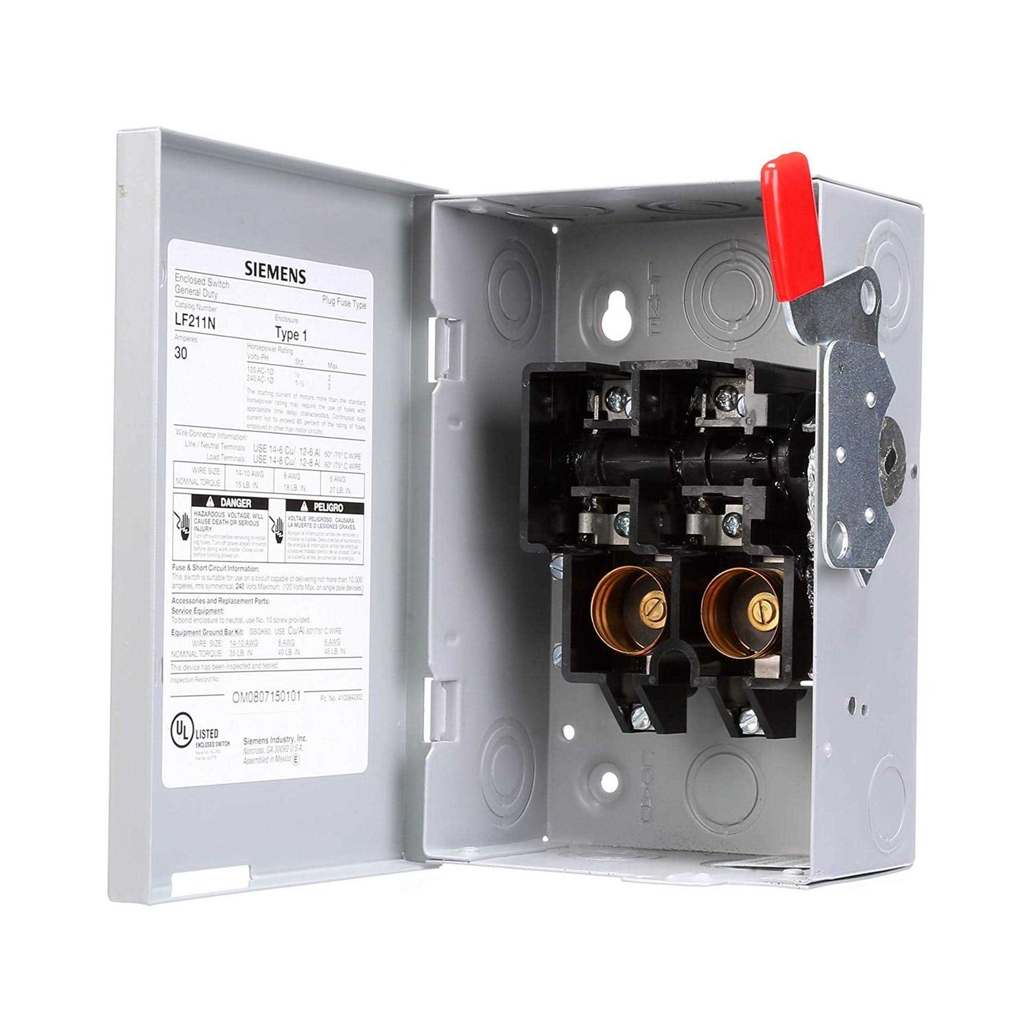 SIEMENS general duty safety switches have a compact size, are horsepower rated, and have a quick make-quick break mechanism. All switches are provided with highly visible “ON” and “OFF” indicators and padlocking provisions on the handle and door. All switches are UL listed and are suitable for copper and aluminum wire. Fuses not included on fusible devices and accept Edison base plug fuses. Use HA type hubs if required.