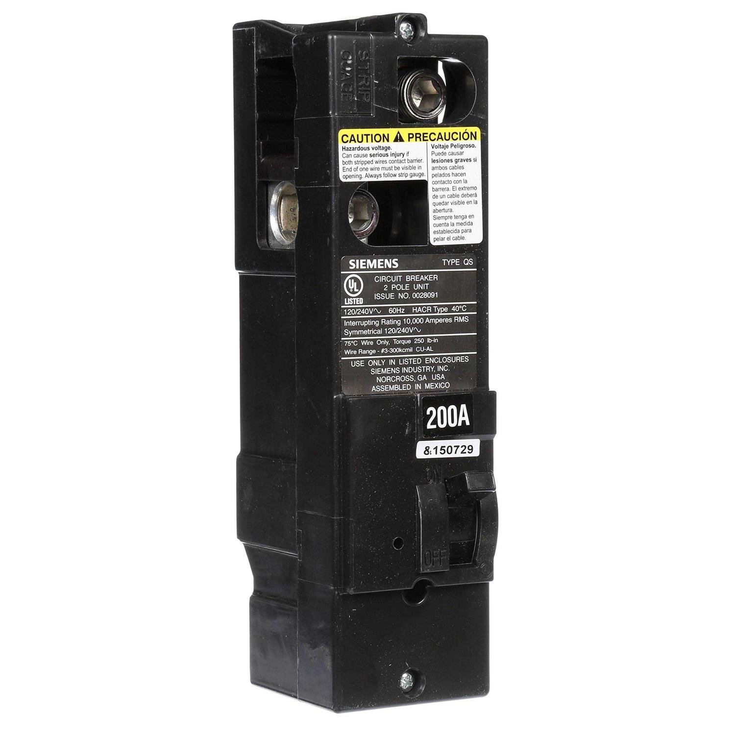 Siemens QS2200 2 Pole Circuit Breaker The Siemens QS2200 is a 2 Pole thermal magnetic molded case circuit breaker with a current rating of 200 Amps and a voltage rating of 240V. It has an interrupting rating of 10kAIC at 240V. The QS2200 has a bolt-on connection type and includes long time and instantaneous trip functions.