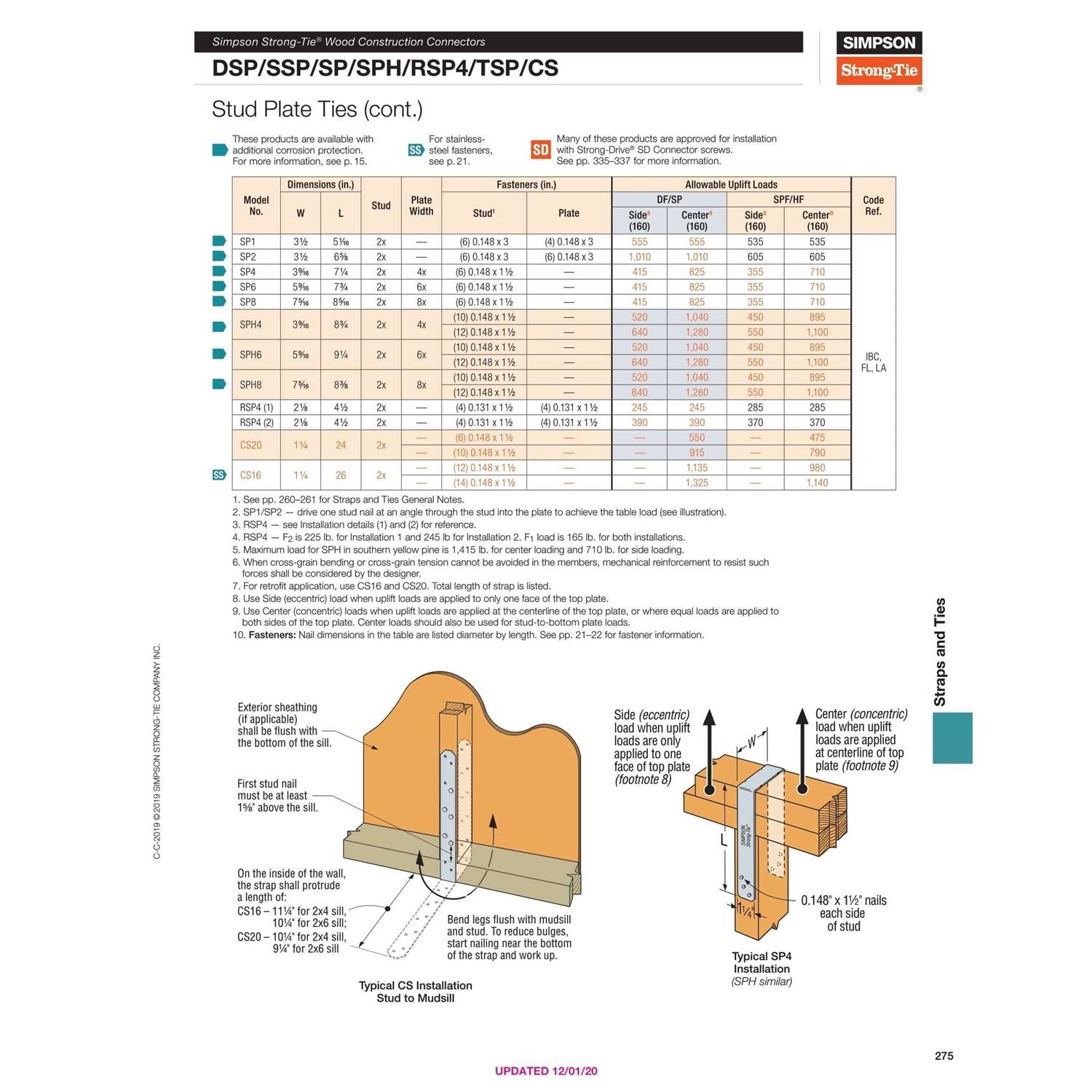 The SP stud plate tie is a plate-to-stud connection providing uplift resistance. Ideal for connecting studs plates at a ninety degree angle to provide additional support. Stud plate ties are suitable for windy environments as the reinforced stud plates are protected from being pulled apart by high winds from hurricanes, tornados, etc. This unit attaches the stud to double top or double bottom plates stud for a low profile finish.