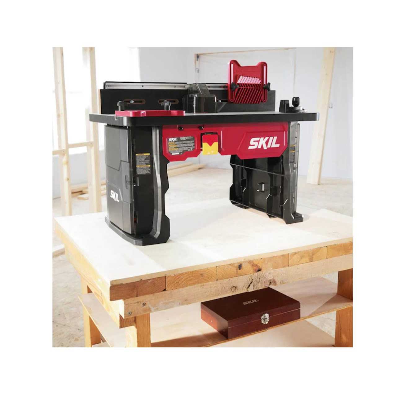 Compatible with many major router brands, the SKIL SRT1039 Router Table brings convenience to the job. Get started with the quick and easy router clamp that attaches your router to the underside of the table. With the above table router lift, you’ll get convenient access to adjust the height of the router bits without reaching underneath the table. This router table is also equipped with a dual-sided integrated router bit storage system to store all your bits in a central location. Guiding the workpiece is smooth with the smooth laminated MDF work surface and two feather boards that reduce kickback. The rigid aluminum router mounting plate includes an aluminum miter gauge slot, a router clamp, and a 24? fence to guide longer work pieces. Look no further as this all-inclusive SKIL Router Table will become your benchtop staple for everything routing.