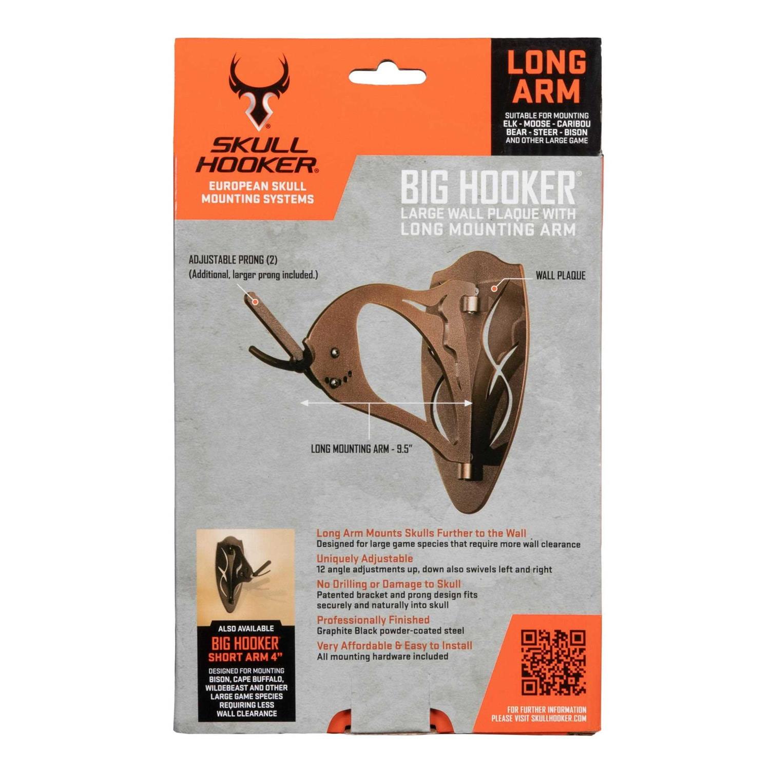 The Big Hooker is a sleek and streamline approach to hanging large to extra large European trophies. The Big Hooker is completely customizable both up and down and left and right to provide the perfect up right and natural presentation of your trophy. The Big Hooker skull hanger is designed specifically for large to extra-large sized skulls (with roughly an elk sized skull and larger) including, elk, bison, moose, caribou, grizzly/brown/polar bears, domestic steer, kudu, giraffe, wildebeest, oryx, stag, cape buffalo and many more of the world’s large and extra large trophy big game species. Constructed of strong powder coated steel and offered in two striking colors (Robust Brown and Graphite Black). The Big Hooker requires no drilling or damage to your skull as the prong fits securely and naturally into the back of the skull. *Skull cannot be cut or altered around the natural hole or cervical joint at the back of the skull. Unlike most other European skull products, the Skull Hooker does not require any drilling into the skull! The patent pending prong system simply and securely slips into the natural holes and crevices inherent in the back of all skulls. Maximize your trophys appearance The arm bracket is fully adjustable to accommodate different species horns or antlers as well as overall look. Large horns/antlers or small, lay your trophys rack back or put it forward you decide. Maximize your trophys location The arm swings right or left to maximize your trophys appearance and location.