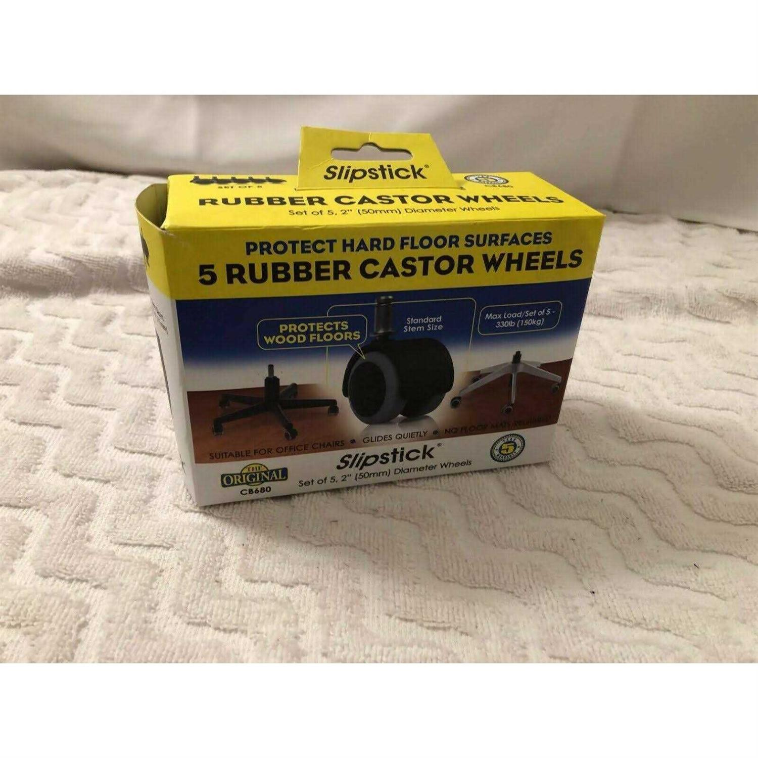 Slipstick floor protecting rubber caster wheels provide smooth, quite rolling and safely protect all hard floor surfaces eliminating the need for plastic desk chair mats. Ideal set of five replacement wheels for office chairs, these two-inch twin wheel rubber casters are quick and easy to install (no tools required) simply pull off the old and snap in the new and you’re ready to roll. Casters feature universal standard size 7/16-inch mounting stem and can support 330 pounds (66 pounds per wheel).