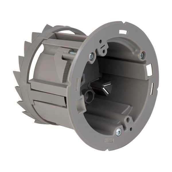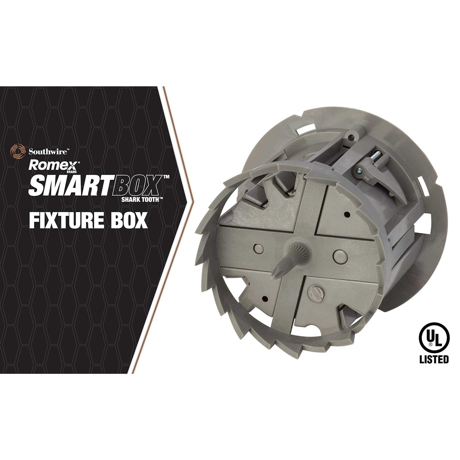 Madison Electric Smart shark tooth device box is the only box that cuts its own hole. The device box has a built-in hole saw to create a perfect-sized hole everytime without any special hole saw or template. The piercing drill bit at the center of the blade assures pinpoint location accuracy. It has polycarbonate construction for durability and strength. This round box with a depth of 2.5-inches, measures 4.38-Inch x 4.38-Inch and has a capacity of 18.3-Cubic-Inches. The box features mount hole spacing to accommodate 3/0 and 4/0 fixtures. This box supports fixture up to 6 lbs. Raised mounting rings with center hole located inside the back wall of the box ensures quick and easy surface mount, basement or attic studs installations. It is ideal for mounting light fixtures, smoke and carbon monoxide detectors. The shark tooth device meets UL and RoHS standards.