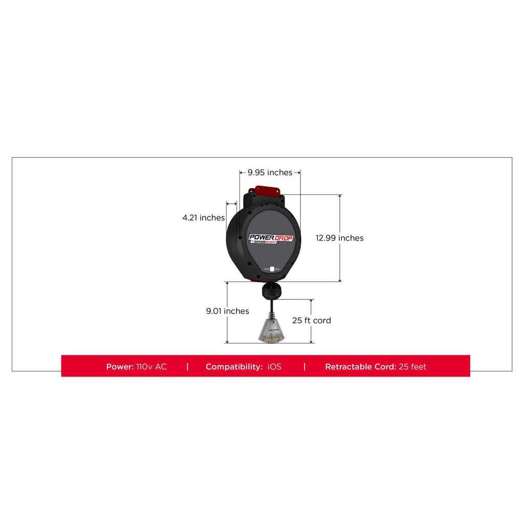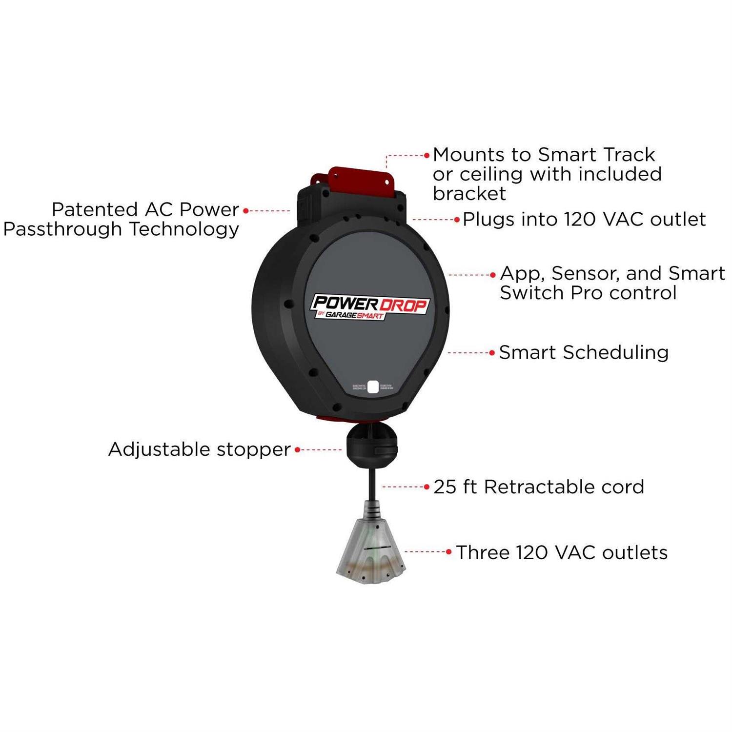 Power your devices with Garage Smart’s Power Drop, a wirelessly controlled, smart retractable extension cord, designed to provide 110v AC power for up to three devices. Program custom schedules, get power consumption feedback, and turn Power Drop on and off remotely from the iOS app. Also works with the Smart Switch Pro (sold separately).