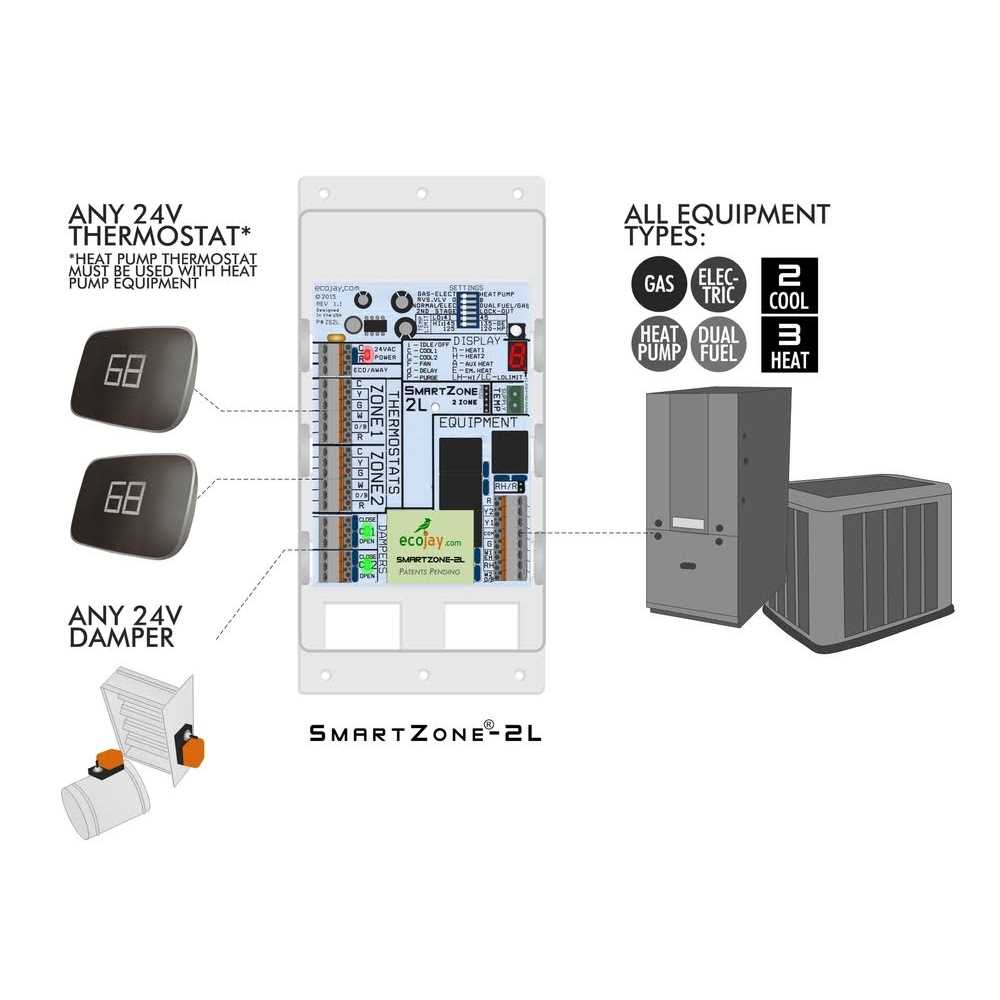 2 Zones (temp Sensor Included)multi-stage Equipment Automatically Controlledeasy To Install & Simple To Useuniversally Compatible – Works With Any Systembest Value In Zoning!!!!! Smartzone-2l (zs2l-t) Smartzone Is A Universally Compatible 2 Zone Control System. It Is A Perfect Drop In Replacement For Almost Any Other 2 Zone Control Panel. Easy To Install, Simple To Setup And Use. No Voltmeter Or Screwdriver Required. Compatible With Any Equipment Type (gas/electric, Heat Pump, Dual Fuel) Compare To Honeywell, April Aire, Ewc, Jackson Systems, Zonex, Xci Controls, Zone First, Zone-a-trol, Durazone & Many More. Go To Ecojay Website For Details & Documentation. North Carolina Residents Call Or Email Ecojay Directly.