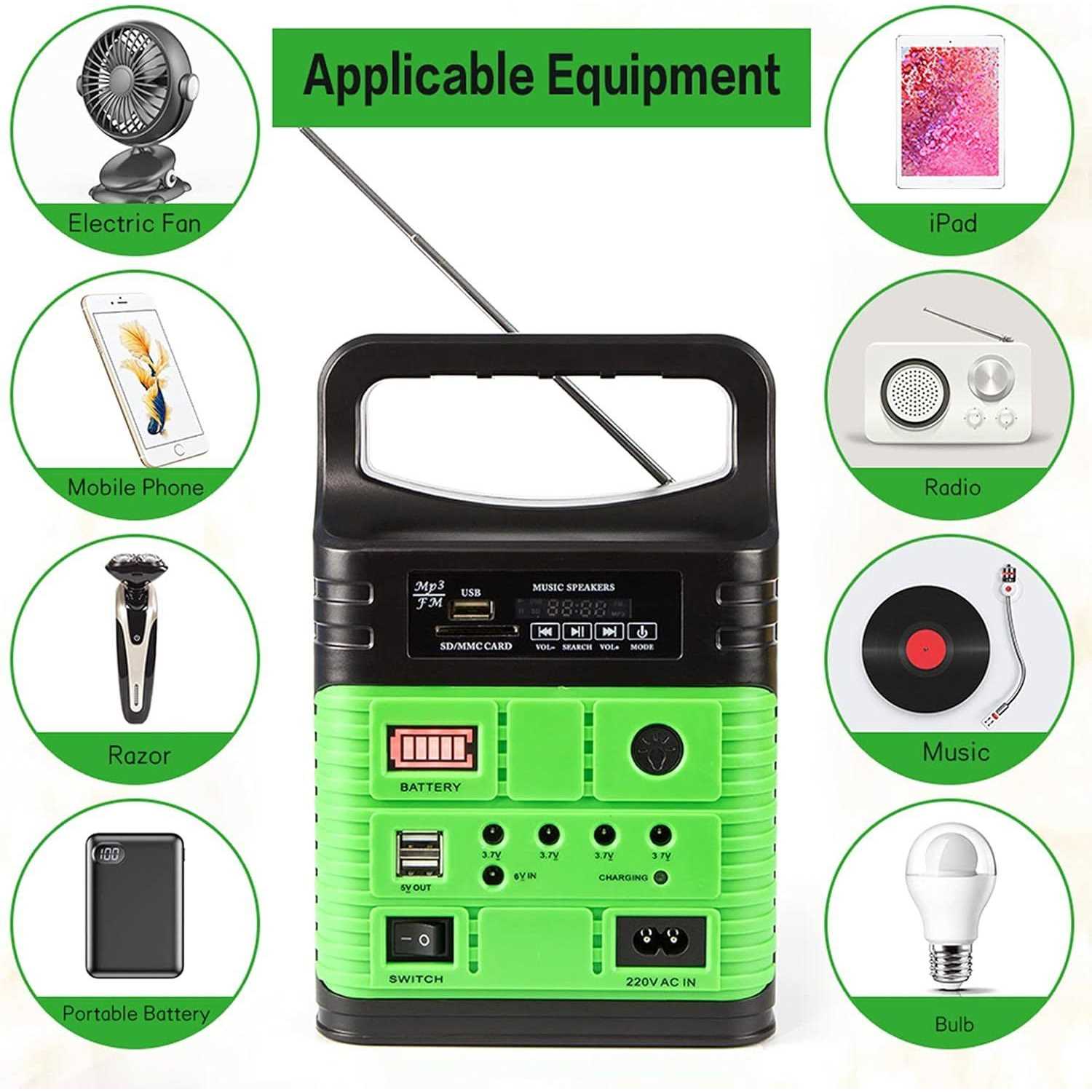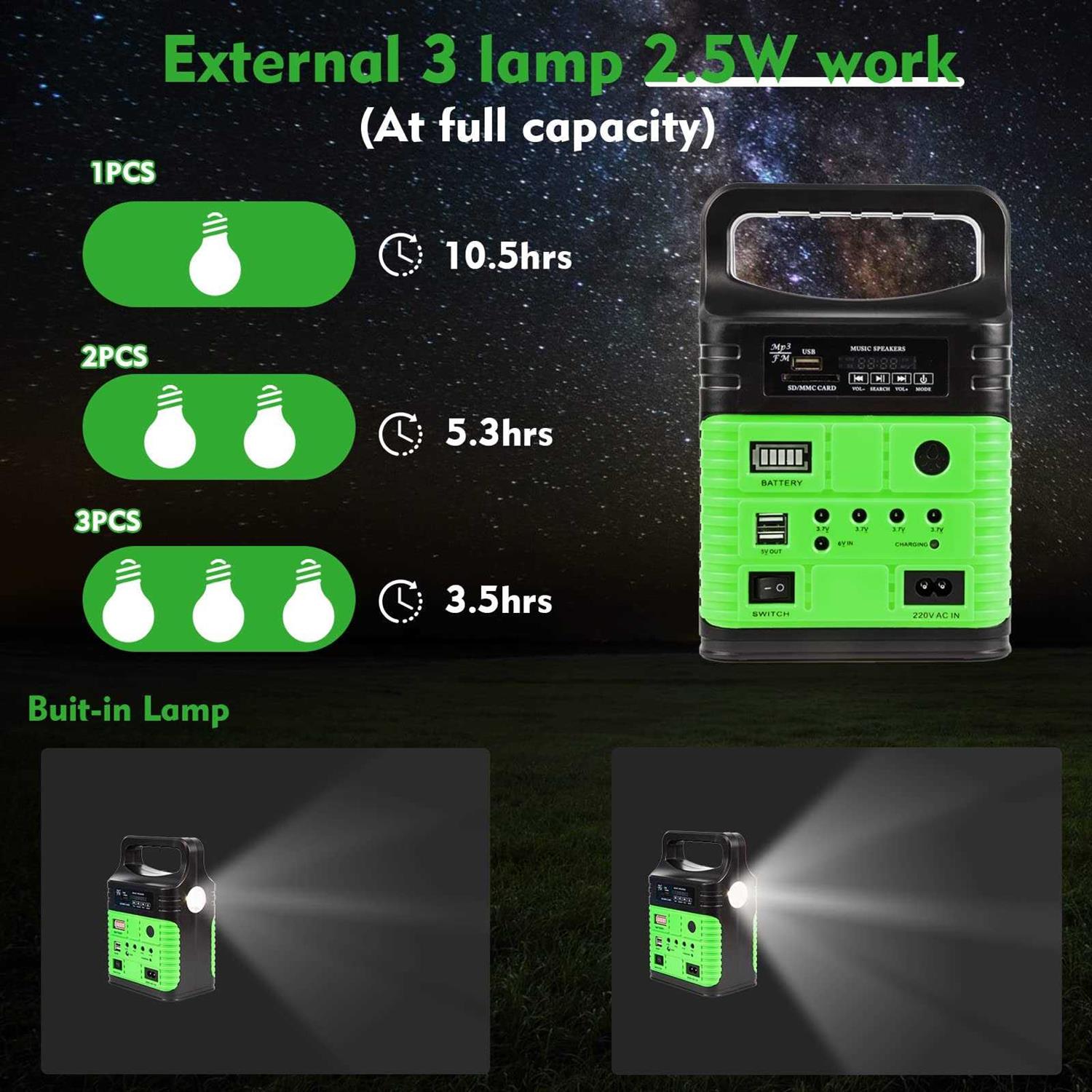 MULTI-PURPOSE SOLAR GENERATOR:This portable power station has built-in LED flashlights and 3 LED lamps with individual switch&3m cable which brings light with low power consumption.Equipped with DC/USB outlets, used for charging small-capacity devices such as mobile phones, e-books, game consoles, digital cameras, MP4, etc. 10000mAh Portable Generator: This solar power station with 10W solar panel,supply power to LED lights and mobile phone. 2 CHARGING WAYS:Our outdoor generator provides 2 charging ways. 10W solar panel charging : about 8-15 hrs to fully charge in full sun. AC charging : suits for wall plug about 10 hours to fully charge. LIGHTWEIGHT & COMPACT:This generator for camping weighs only 1.8 lbs, comes with a handle, easy to carry.widely used in all kinds of outdoor activities, camping, tourism, adventure, fishing, hunting and outdoor yard activities as emergency power supply. Package Contents1* Solar Power Generator , 1* Solar panel, ,1* Power cable, 1* Multi function USB cable, 3* LED Lamps 1* Remote Control 1* User Manual”