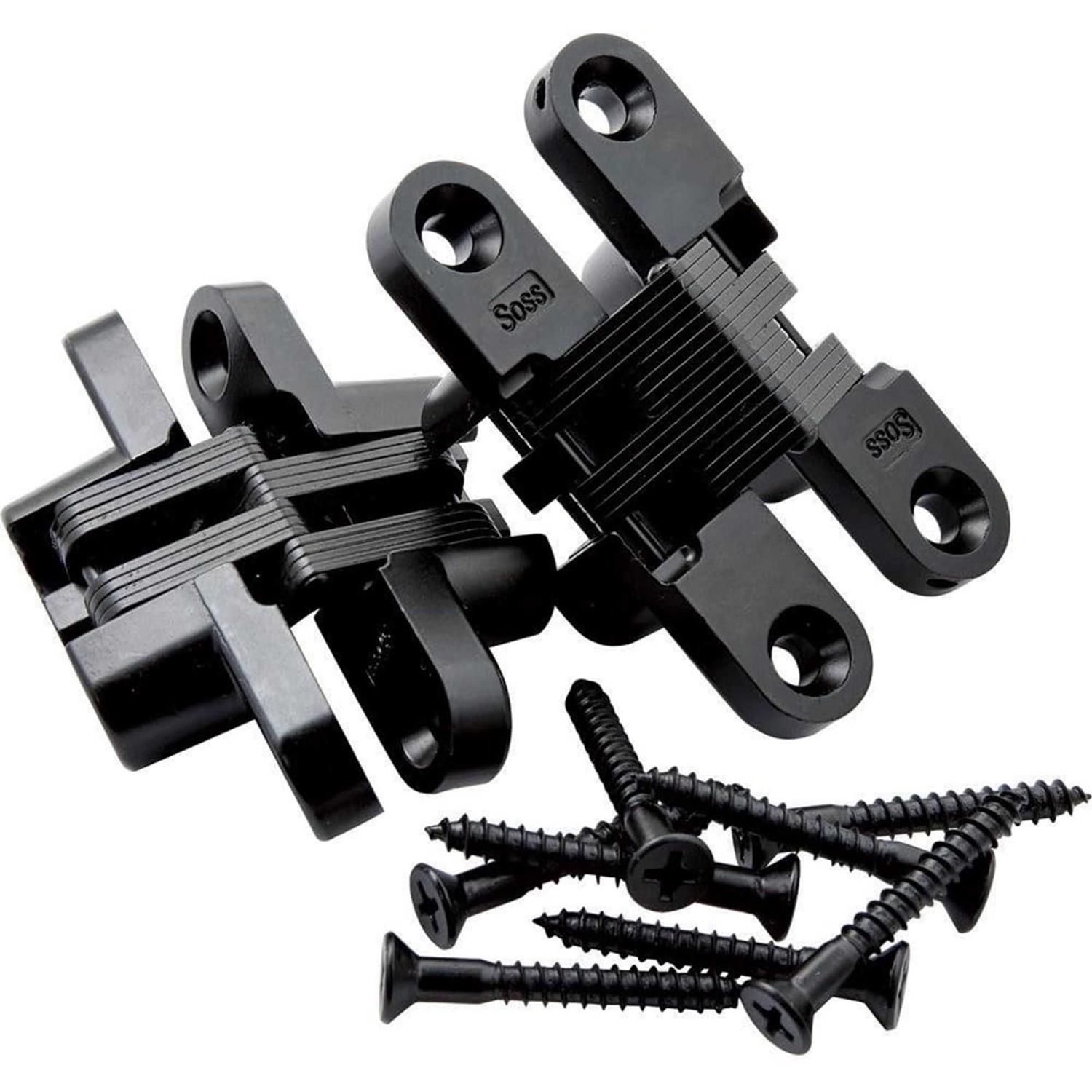 These versatile hidden hinges offer exceptional strength, security and smooth operation. Regular hinges support weight on a single knuckle located outside the jamb, but these hinges place the weight on multiple moving pivot points within the hinge body so they can bear heavy loads. They seat flush in a deep mortise to resist sagging, remaining inconspicuous and tamper-resistant when closed. The interlinked laminated steel plates move smoothly and silently, opening 180°. Easily installed with a drill in wooden doors and frames (see note below). Minimum material thickness of 3/4″ required. Cast in heavy-duty zamak, with a satin brass, satin chrome or black finish, these hinges are designed to last a lifetime. Instructions, screws and drilling template included. Note: You can use a drill to cut mortises for SOSS hinges; however, using a plunge router with spiral upcut bits gives better results since they cut cleanly and clear material efficiently. You can easily make a router-mortising jig using the included drilling template. To determine the size and number of hinges needed per door, consult the Specifications tab.