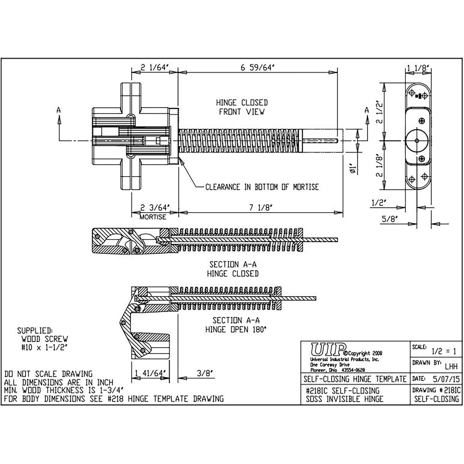 SOSS Invisible Hinge model #218IC is ideally suited for all types of doors. The SOSS Invisible Spring Closer gives you a spring closer that is totally invisible from either side when the door is closed. The closure rate is completely adjustable with an allen wrench after installation and does not require removal of the spring closer. Installation can be either inside the door itself or inside the door jamb. SOSS Invisible Hinges open a full 180 and are a single action hinge.