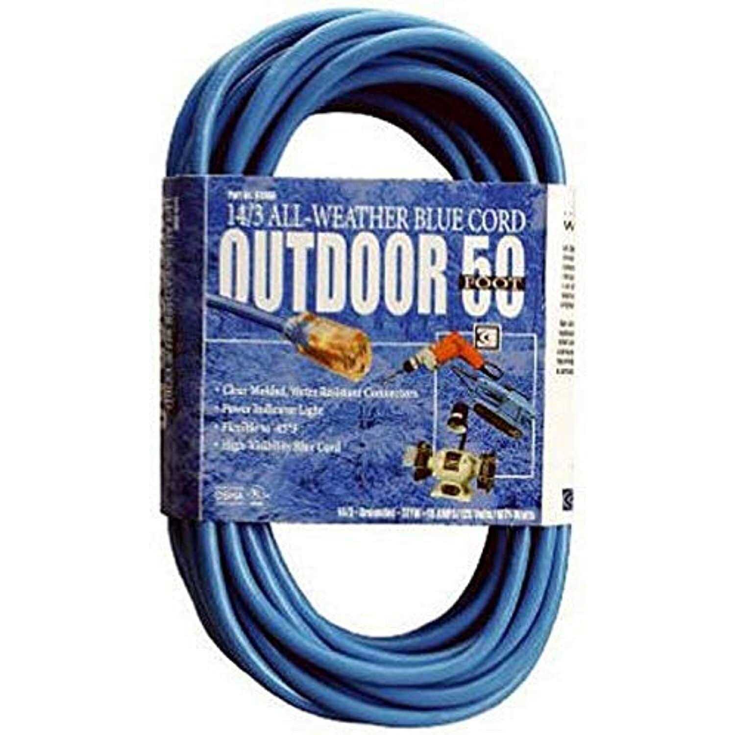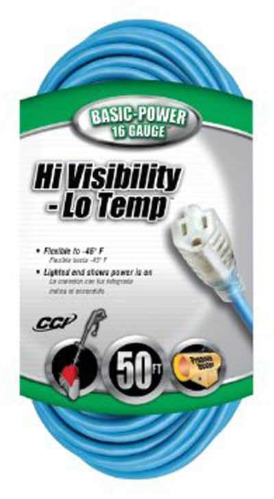 This cold weather extension cord is rated for -58F to 140F (-50C to 60C) to withstand harsh, winter temperatures. It’s 50 foot in length and is made up of all-copper wire and recommended for use with medium duty equipment and tools. The Hi-Vis bright blue color jacket provides extra safety as well as prevents loss and theft on job sites. The over sized, clear molded plug prevent accidental bending or breaking, and the lighted end shows power is on and cord is ready to use. UL listed.
