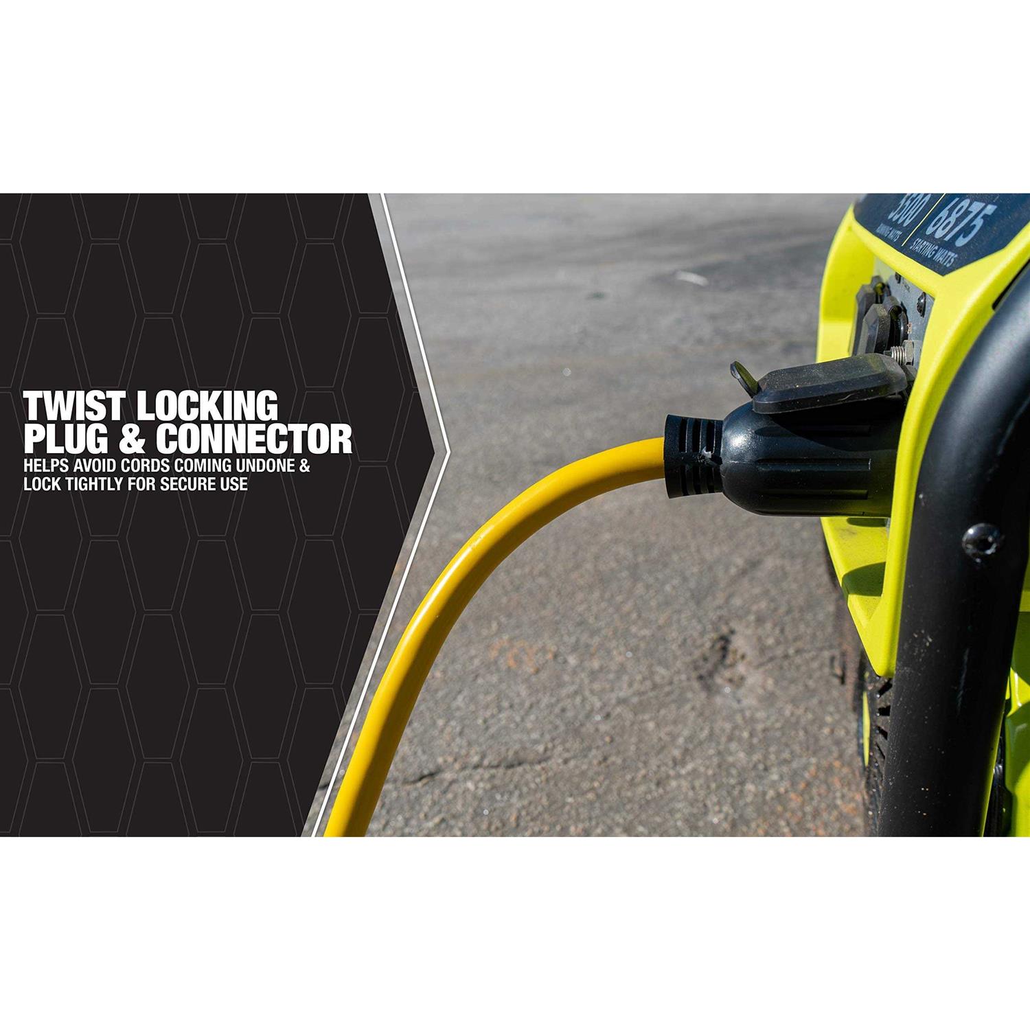 Cords, Plugs & Adapters by Southwire. This cord is yellow with a black L14-30 plug and receptacle, which avoids cords from coming undone. Limited lifetime .