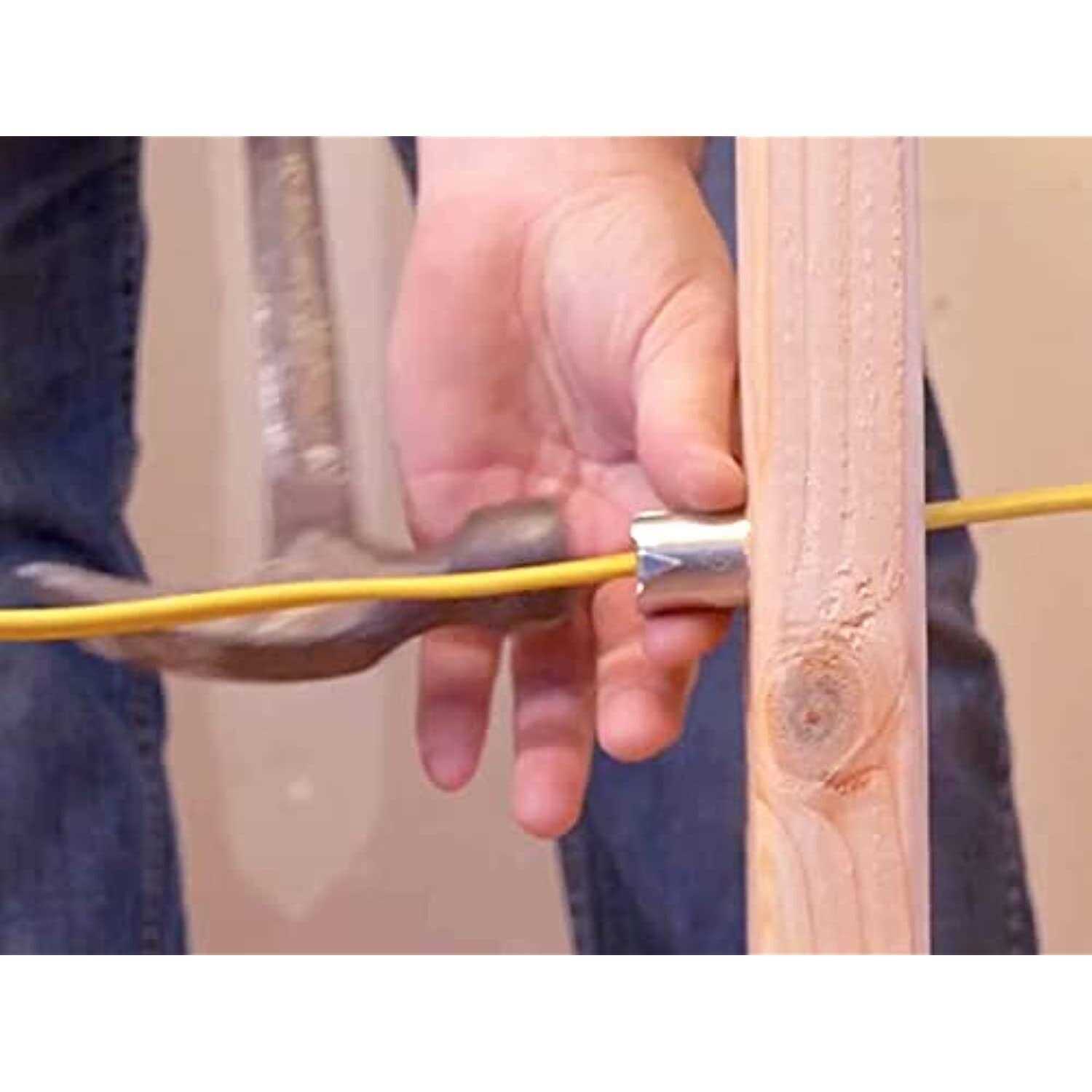 Protect two sides of a stud with this Smart Shield nail guard. The distinct cylindrical design eliminates the need for multiple standard nail plates. With surface mounted nail plates, you can have a quicker, easier installation and eliminate drywall budge. It resists direct strikes from nail guns and screws, and it keeps wire and cable protected in wood framing. For convenience, you can set it up before or after a cable is placed.