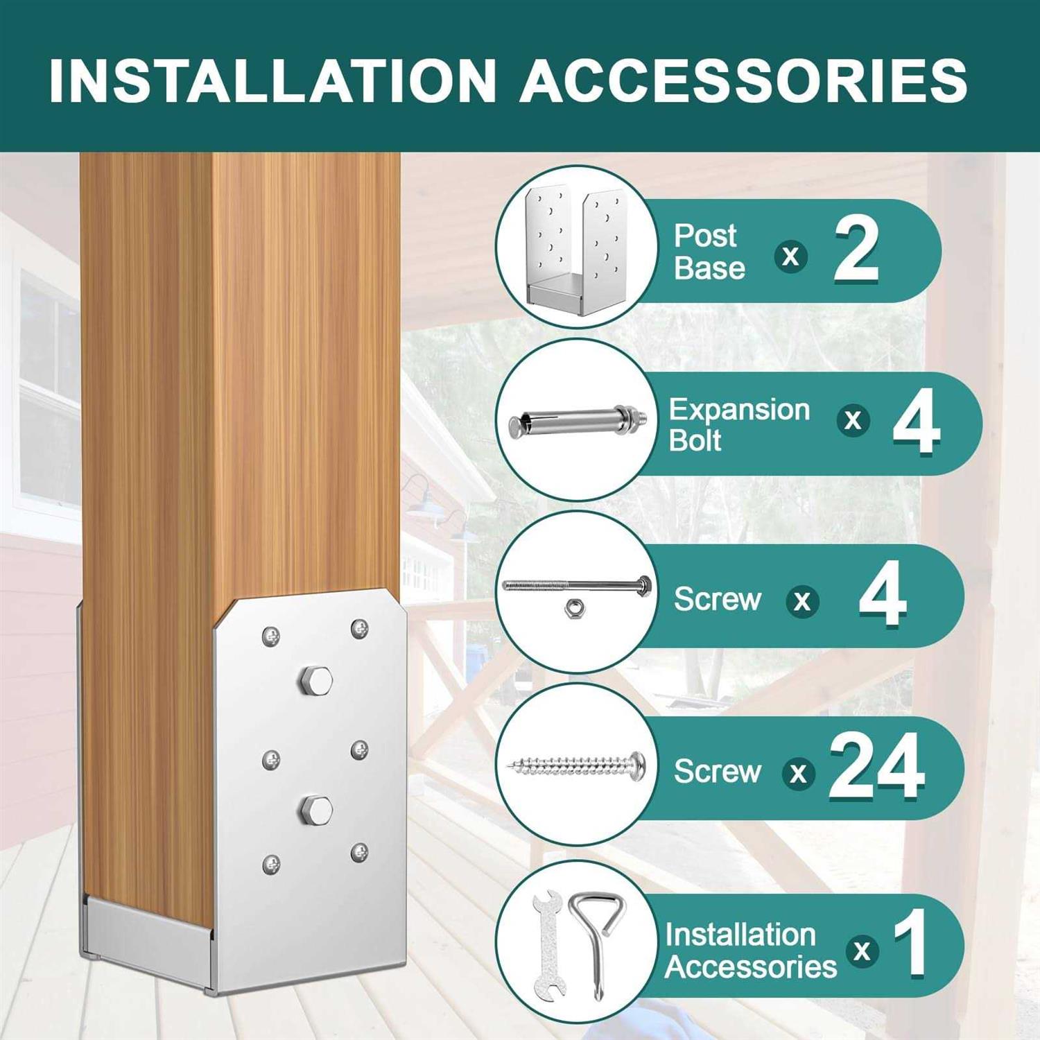 Caps by SPACEEUP. Details:SPACEUP Standoff Adjustable Post Base Stainless Steel Post Base Adjustable, perfect for 4 x 4 post. key Features FIRM AND STEADY Item size: 3.74x 3.15 x 5.17″; Quantity: 1 Pcs; The post base is made of 2 mm stainless steel, plated with fiber varnish on its surface. It can prevent the post anchor from rusting, which is stable enough to support the bottom of the post. 1″ plat effectively prevents corrosion of wooden posts. APPLICABLE SPECIFICATION Inner diameter of the post bracket is 3.74x 3.15″. The post base is perfect for 4×4 wood. The slot makes it flexible, which can be adjusted according to the actual size of the wooden column. You can easily use it to install the the concrete for decks, patio covers and other top-supported structures. ADEQUATE ACCESSORIES 1 x wrench, 1 x screwdriver, 24 x screws, 4 x M6*210 Bolts and 2 x M8*80 Bolts are supplied. They are enough to fix the post base. So you do not need to buy other accessories. APPLICABLE…