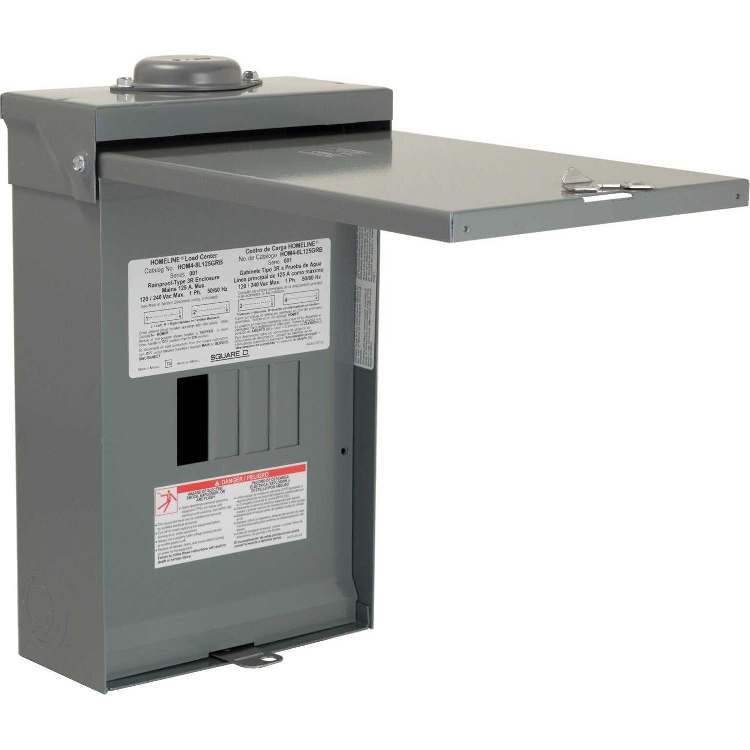 Schneider Electric/Square D Homeline 1-Phase 3-Wire Fixed main load center in gray color has tin-plated aluminum busbar construction with a welded galvannealed steel enclosure for durability. It has a voltage rating of 120/240 VAC and current rating of 125 Amps. It has eight circuits four tandem circuit breakers and four spaces for convenient operations. Load center has short-circuited current rating of 10/22 kilo-Amps. It has NEMA 3R outdoor enclosure to provide protection against rain and ice formation. It has ground bar and factory installed main lug for easy connectivity. Load center can be used in residential commercial and industrial applications to provide protection from electrical hazardous. It measures 8.880 Inch x 4.270 Inch x 14.800 Inch. Load center has QOM2 main frame size main breaker for easy installation. It has surface cover to improve aesthetic look. Load center can accommodate copper wires of size 14 – 2/0 AWG and aluminum wires of size 12 – 2/0 AWG. Load center is UL listed.