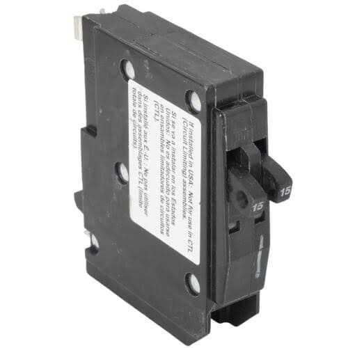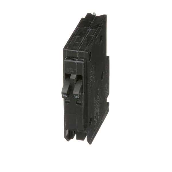 QO and QOB one two and three pole thermal magnetic circuit breakers provide overcurrent protection and switching on ac and dc systems. These circuit breakers have an over center trip-free toggle mechanism with quick-make quick break action and positive handle indication. They also have VisiTrip trip indication which provides a visual indication that the circuit breaker has tripped and interrupted the circuit. This QO tandem miniature breaker is rated as 15 A and 15 A 12/24 V and 1 pole. This unit provides 1 kA breaking capacity and plug-on mounting. A full line of factory installed accessories is also available such auxiliary switches alarm switches and shunt trips. This unit is compatible with plug-on neutral system. QO breakers use a compact 3/4 inch width design for small system footprint. QO circuit breakers are UL Listed under UL File E84967 and are CSA Certified under CSA Master Contract 153555.