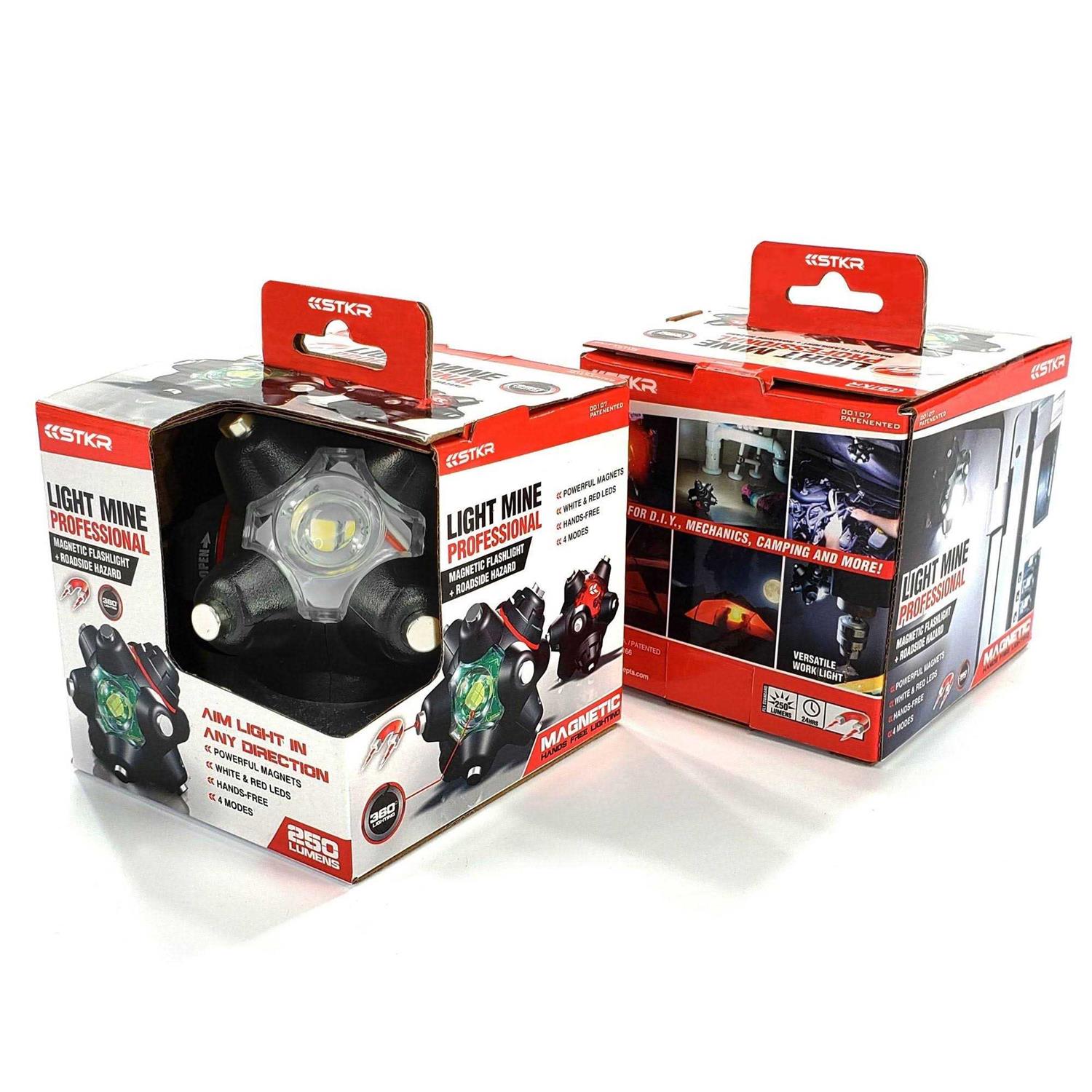 Please pay with STRIPE. Our prefered payment provider. The Light Mine Professional has designed protruding posts that give the light an underwater naval mine appearance and can be used as tripods or quad-pods creating a 360-degree freestanding light. Eleven powerful neodymium (rare earth) magnets are located at the end of each post allowing the user to attach and aim the light accurately and securely in any direction. Powerful lumen tech LEDs are used in the front white lens (8 LEDs) and back red lens (4 LEDs). The Light Mine Professional has four electronic light functions; low power spot, high output flood, red night vision, and a high visibility signal beacon. The Light Mine Professional is about the size of a baseball.