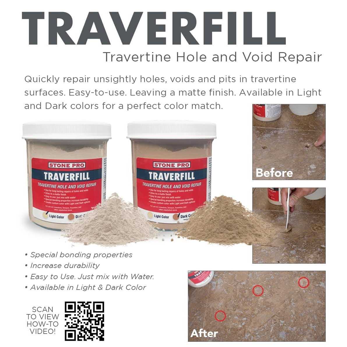 Easy-to-use Repairs unsightly holes in travertine Available in Light and Dark colors Dries to a matte finish Powder is converted to a paste by adding water and is applied like spackle Traverfill is an easy-to-use travertine repair product that permanently repairs unsightly holes, voids, and missing travertine fill. If unsightly holes and pits are making your travertine floor look horrible, StonePro Traverfill is your answer. Is available in either LIGHT or DARK colors to match most travertine and can be mixed to create your own custom color. Dries to a matte finish. This powder is converted to a paste by adding water and is applied like spackle.