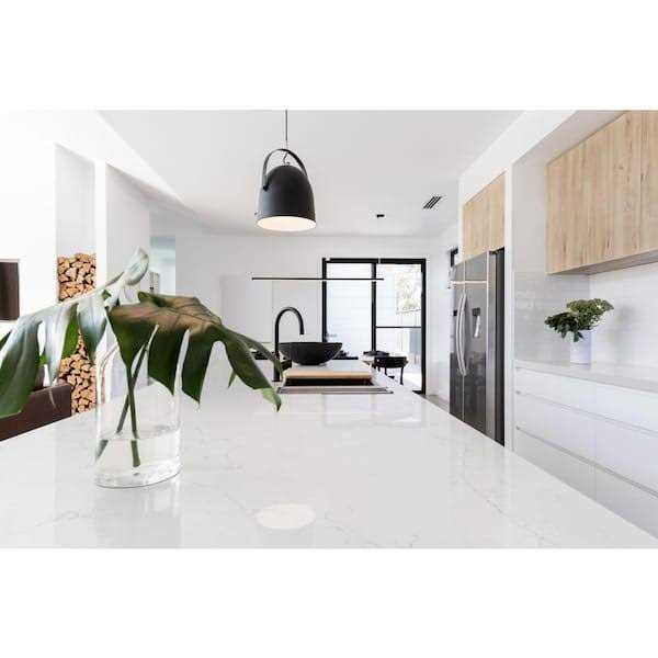 The beauty of quartz is derived from its multi-dimensional, gem-like color. Quartz delivers distinctive depth, brilliant clarity, glimmering radiance and a cool, solid feel that is unique to quartz. Quartz countertops are manufactured using up to 94% quartz with resin binders. Color: Calacatta Botanica.