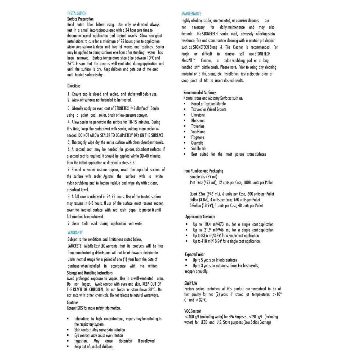 Offers maximum stain protection against oil and water based stains. Best sealer for the most porous natural stone, tile, masonry and grout. Breathable, penetrating sealer preserves the original look of the surface. Water-based formula – Better for you and the environment. Low odor, non-flammable and weather resistant – For interior and exterior use. Professional grade for quality protection every time Normal cleaning practices should be maintained. STONETECH BulletProof Sealer is a water-based penetrating sealer that provides maximum stain protection while preserving the natural look of the surface. It can be used as a grout sealer, tile sealer, masonry sealer and in many other applications. This premium sealer offers the best protection on the most porous natural stone, tile, masonry and grout surfaces in interior and exterior applications. This water based sealant is great for use as a countertop sealer, backsplash sealer and on kitchen countertops, bathroom vanities, walls and floors.