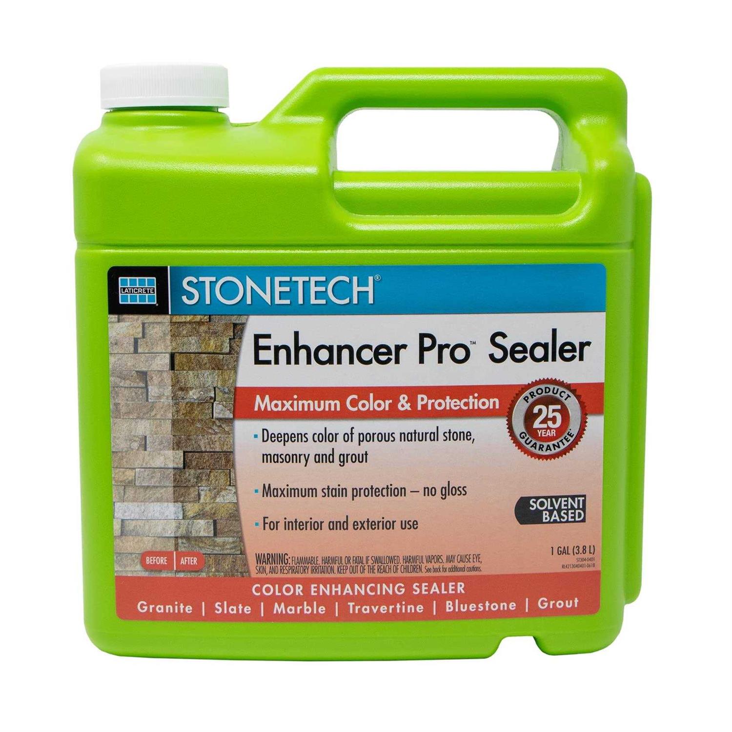 Deepens color of porous natural stone, masonry and grout Maximum stain protection – no gloss For interior and exterior use Weather and UV resistant Solvent-based formula – Professional grade STONETECH Enhancer Pro Sealer is the color enhancing, penetrating sealer that provides maximum color & stain protection on natural stone, masonry and grout. It deepens the natural rich color of porous surfaces without altering the finish and penetrates deep to protect it from staining. This solvent-based enhancing sealer is of professional grade, weather & UV resistant, and designed for use in interior and exterior applications. Great for augmenting the look of a stone floor or reviving a worn surface.