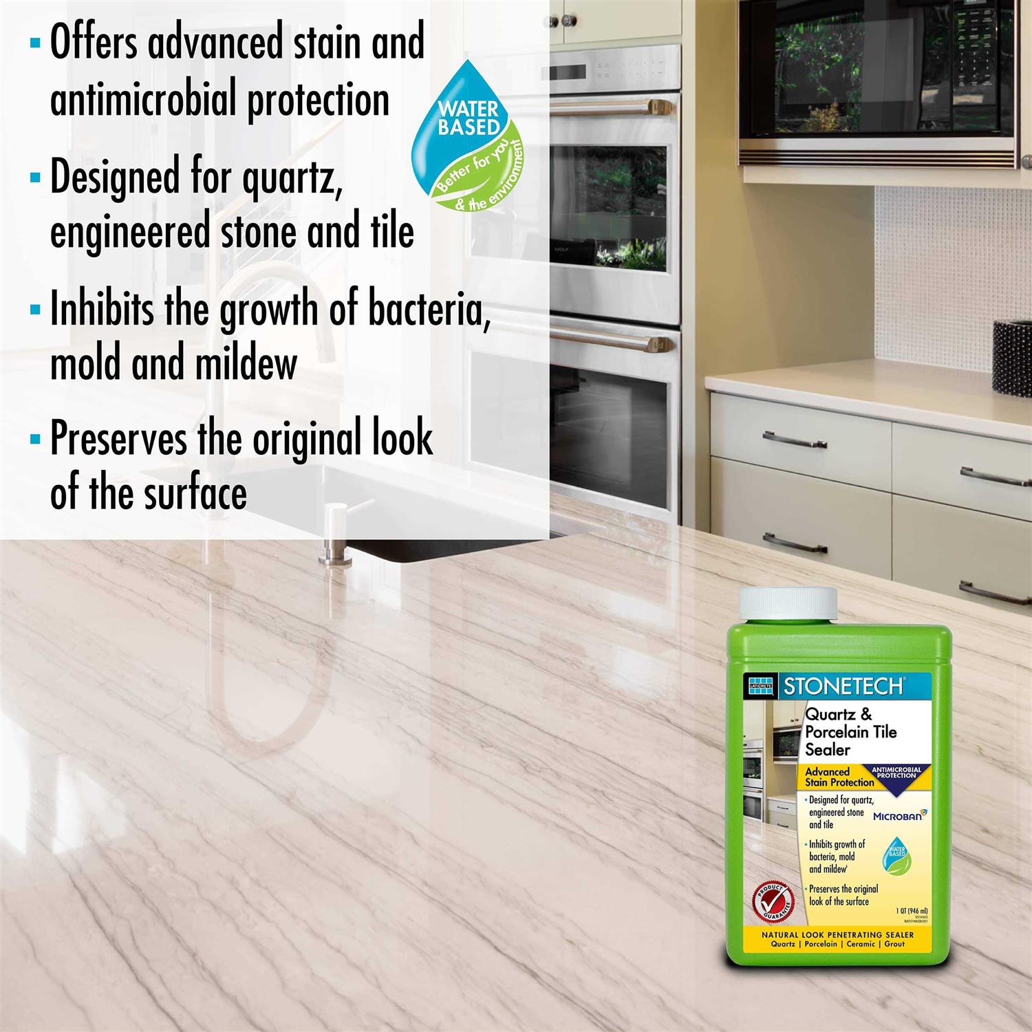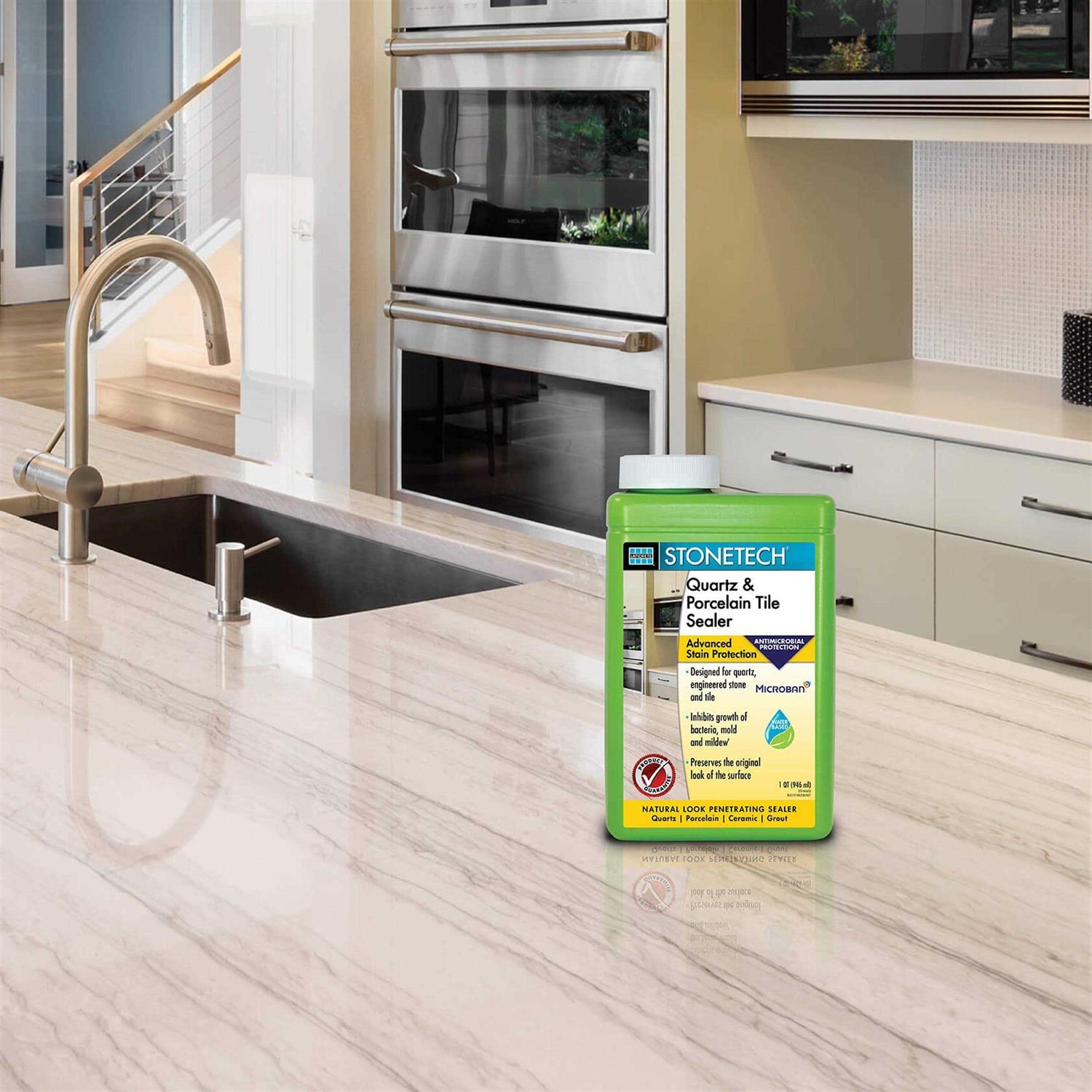 Advantages Provides water, oil and stain protection Water-based formula Preserves natural look Designed for quartz, tile and engineered stone Protects medium to dense porous surfaces Suitable for food areas Interior and exterior use STONETECH Quartz & Porcelain Tile Sealer is designed to protect quartz, porcelain tile and medium to dense surfaces from oil, water and most stains, all while preserving the natural look of the surface. It can also be used as a pre-grout sealer. For cleaning see STONETECH Quartz & Tile Cleaner.