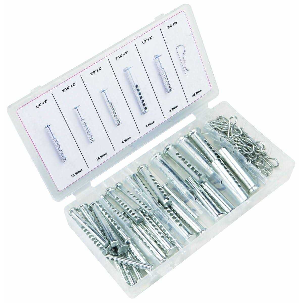 This assortment of clevis pins is ideal for replacing worn retaining bolts or pins in your vehicle or home! The clevis pins set includes 37 assorted pins and 37 matching clips with 8 pin adjustments for a perfect fit. Zinc plated to resist rust, the clevis pins come neatly organized in a convenient plastic storage box.