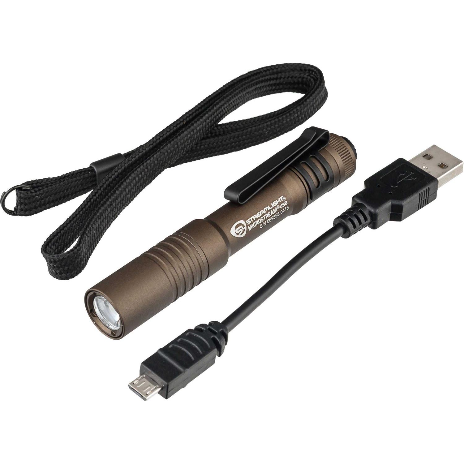 Streamlight 66609 Overview 1 Description 2 Light Performance 3 Switching 4 Construction Details Light enough to clip to the brim of your hat and USB-rechargeable, the coyote Streamlight MicroStream USB Rechargeable Compact Flashlight is one handy little torch. Measuring less than 4″ long and weighing just 1.2 ounces, it produces 250 lumens on high power and 50 on low. Slide the front of the machined, anodized aluminum housing forward to reveal a micro-USB charging port; the light’s 350mAh li-ion battery charges in about four hours and provides 1.5 hours of runtime on high and 3.5 hours on low. The tailcap push-button switch controls momentary and constant-on operation and toggles between high power and low. The removable clip holds the light steady in a pocket or on a hat brim, and a wrist lanyard and 5″ USB cord are included. Use of them does not imply any affiliation with or endorsement by them.
