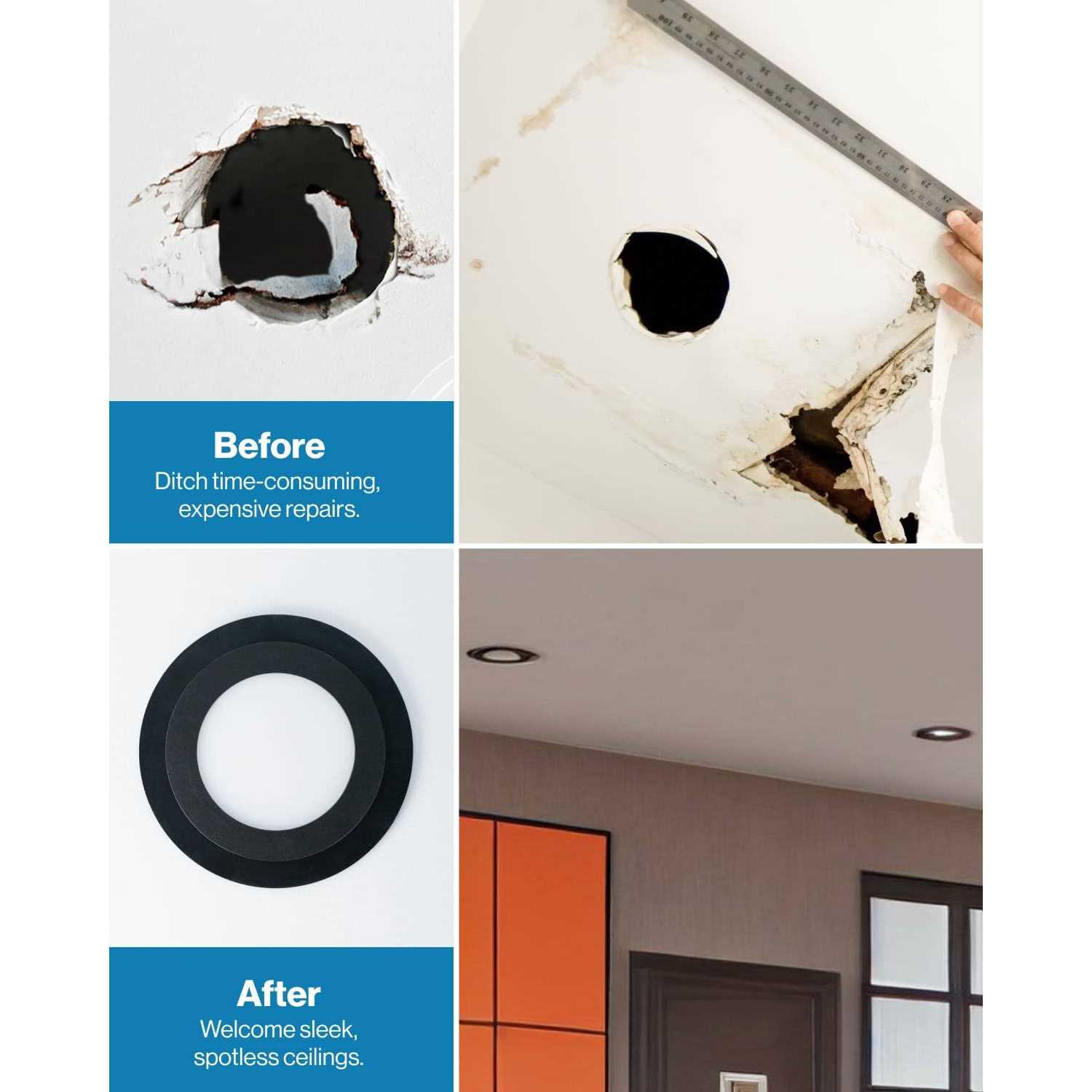 Top Rated Goof Ring Covers 8.6 Inch Diameter Fits 5 Inch / 6 Inch Recessed Downlights CLEAN LOOK – Cover up unsightly ceilings with torn drywall from trim removal, mis-cuts, and over-sized holes with our clean matte white finish goof ring. A goof ring is the ideal solution to cover rough drywall, hide oversized holes made during an upgrade of your recessed lighting. DIMENSIONS – Outer Diameter: 8.6 inches. Inner Diameter: 6.2 inches. Thickness: 0.12 inches. FLUSH & EASY INSTALL – This trim overlay sits flush against the ceiling in between the drywall and the recessed light. It easily slips onto the back of your recessed light and fits between the light’s trim and the ceiling drywall to hide unsightly gaps. Also works with ceiling fans and pendant lights. No tools are required for install.