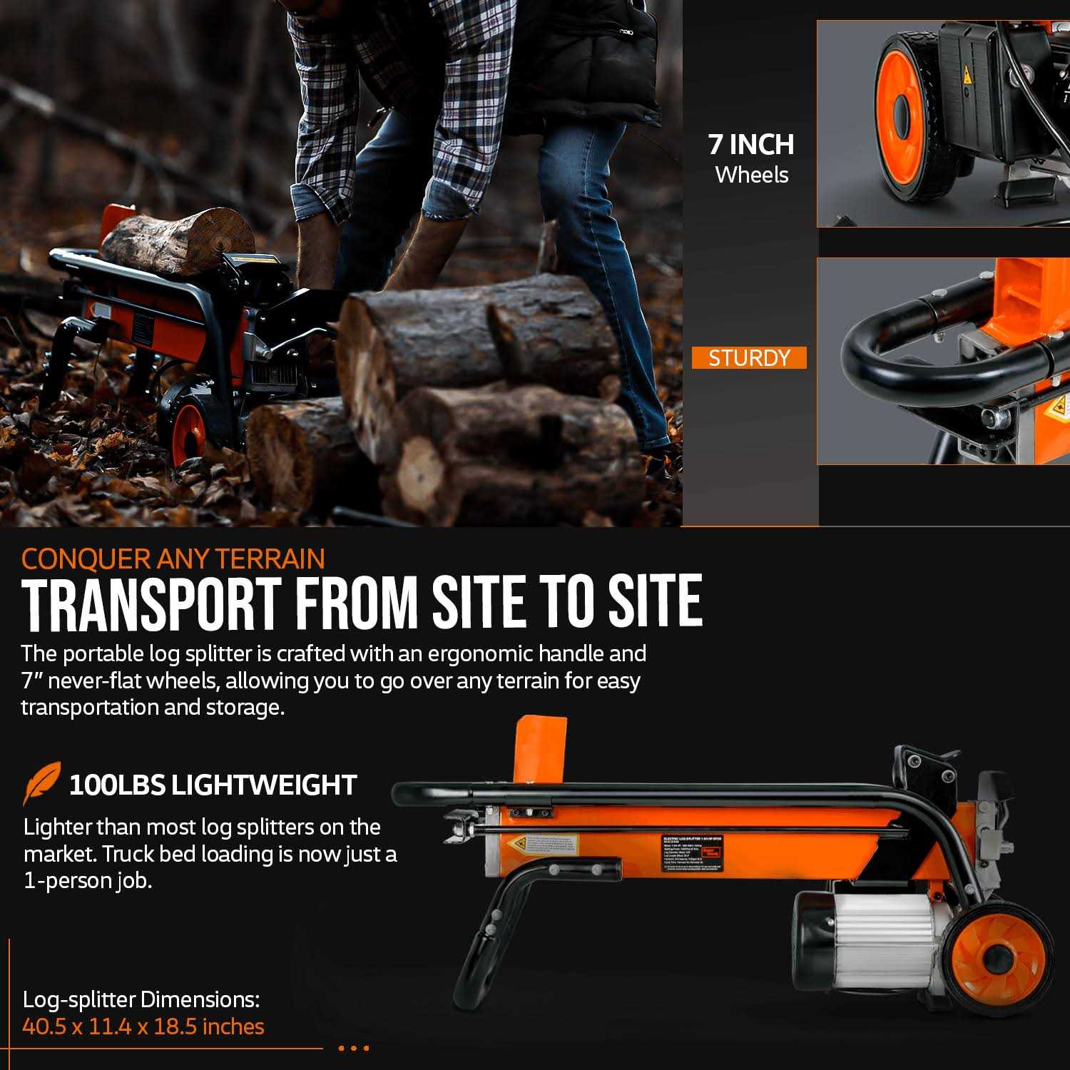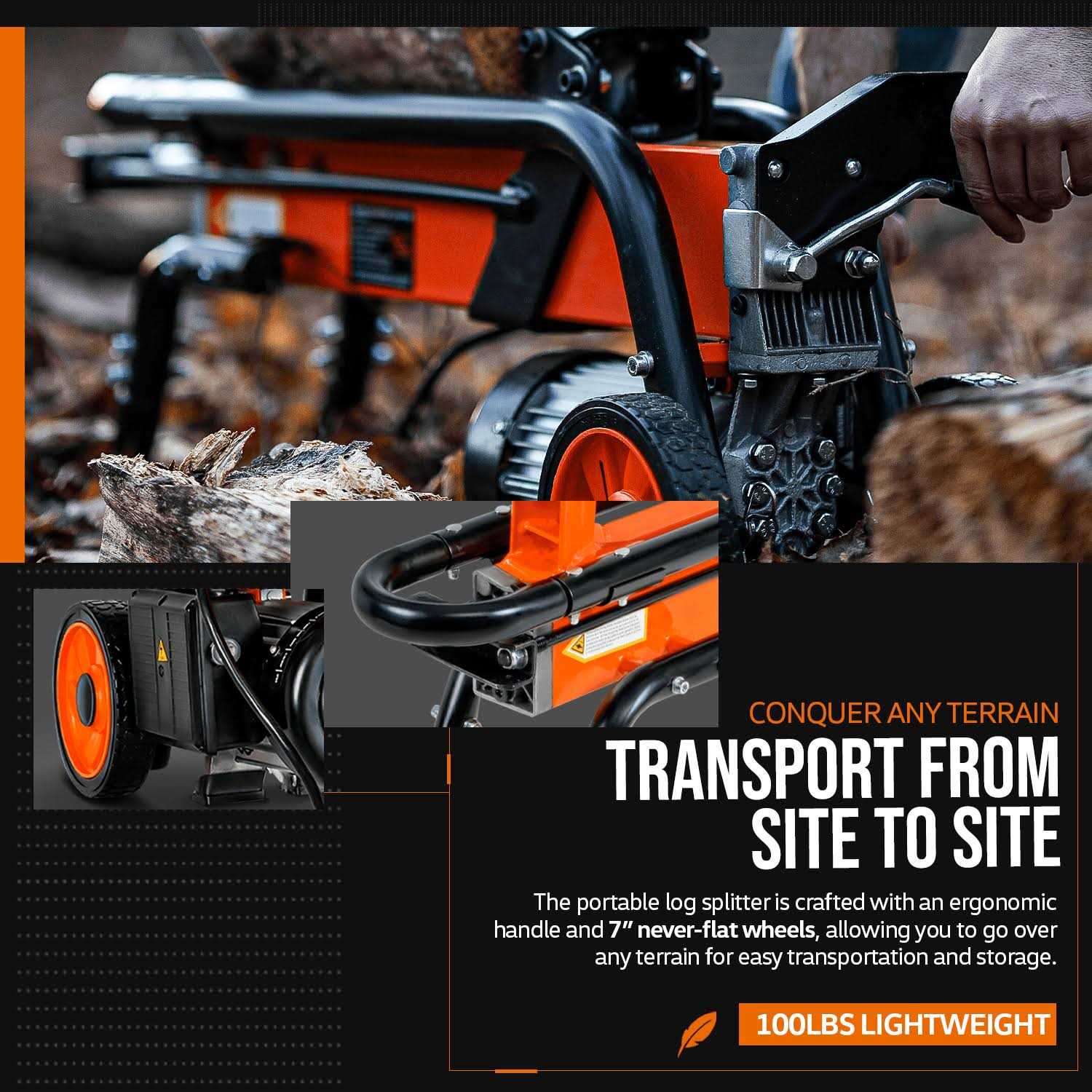 Lightweight and portable, with a 6-ton hydraulic system and 13,500 pounds of pressure to easily split logs up to 10″ diameter. Electric-powered and complete with sturdy transport wheels for easy maneuvering. Always operate with eye and hand protection.