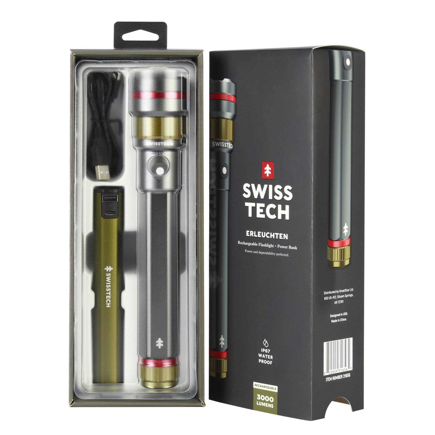Swiss Tech Erleuchten 3000 Lumen LED Flashlight, IP67 Waterproof, Drop Resistant, Rechargeable Flashlight with 5200 mAh Power Bank