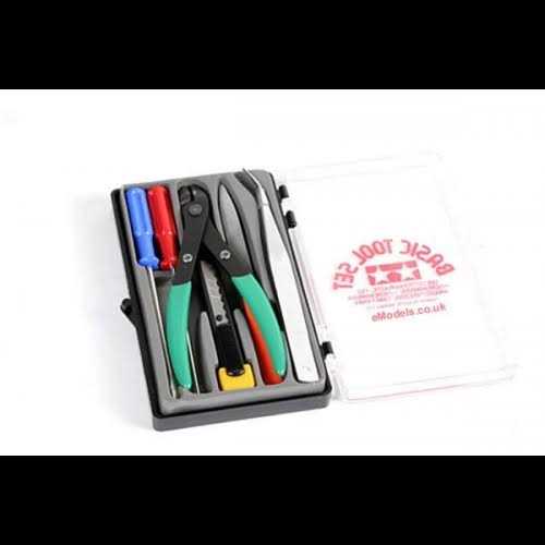 This is a Basic Tool Set from Tamiya. FEATURES Contains the basic indispensable tools for model and craft work. One pair of side cutters for plastic. One angled tweezers. Small phillips screwdriver. Small slotted screwdriver. One craft knife. One metal file. Packed in a handy plastic case. INCLUDES One Basic Tool Set.