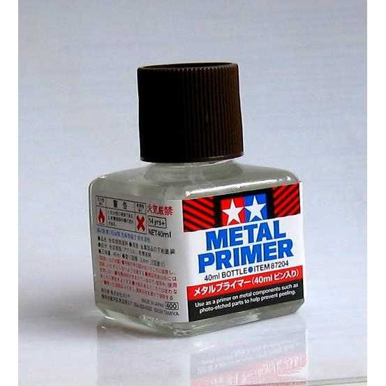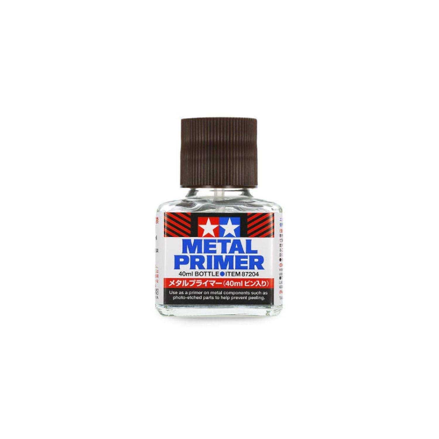 Tamiya 87204 Bottled Metal Primer 40ml Overview Photo-etched, aluminum, die-cast and other metal components can add great detail to your plastic model, but special care is needed when painting them – this product has been developed to aid in that process. Use it as a primer coat on metal components for a true topcoat and prevention of peeling. Causes no damage to plastic parts, freeing you up to use it on parts which are already attached to the model. Can be sprayed on via airbrush if so desired. Cap features a handy applicator brush. Bottle contents: 40ml.