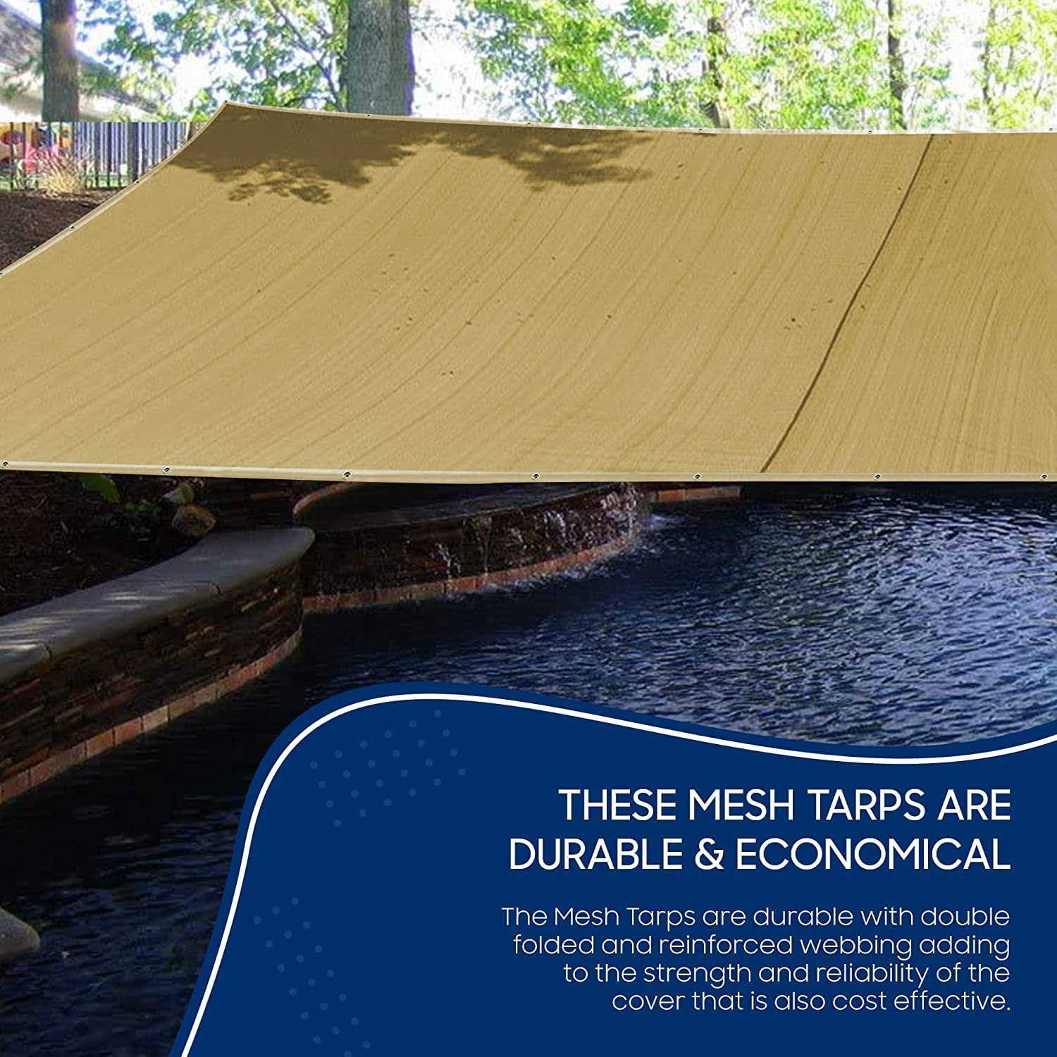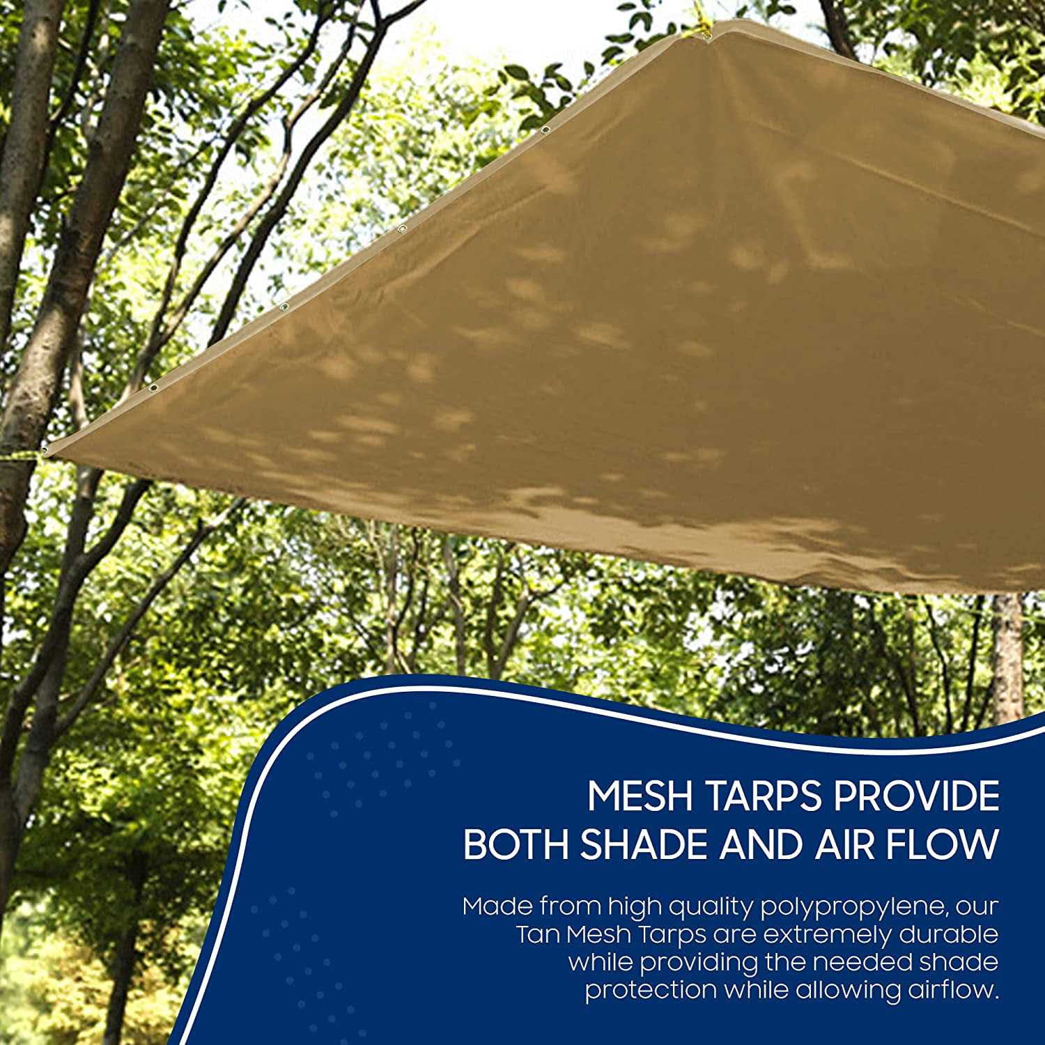 Tarps Now offers cover mesh tarps with brass grommets which are very affordable and reliable. Our Desert Tan Mesh Tarps allow airflow and sunlight to pass through the material that extending the service life. These tarps are great for construction, agriculture, commercial and industrial applications. 75% SHADE MESH TARP: These 75% shade Mesh Tarp knitted 100% virgin resin HDPE Polypropylene that will not be torn easily. TOUGH AND DURABLE: Our tarps are structurally durable with reinforced webbing to prevent edge wear and deformation. COLOR AND SIZES: The size of this Tan Mesh Tarp is 30′ X 40′ (Actual Size 29′-6 inch X 39′-6 inch). The color is Tan where thickness is 50mils and weight is 6.8 oz. per sq yd. RUSTPROOF BRASS GROMMETS: The tarp covers are crafted with rustproof brass grommets in the corners for secure tiedown and spaced approximates every 18-inches. PERFECT FOR: Mesh Shade Tarps are perfect for use as windscreens, privacy screens, shade screens, canopy tops, canopy sides, etc. Tarps Now 50 mils mesh tarp with 75% shade factor and rust-proof eyelet can withstand all tough weather conditions. Strong brass grommets come with rugged hems that are reinforced with webbing. Tan Mesh Tarps are not water-resistant as they are designed to allow airflow. Please Note: These shade Tan tarps are finished size (+/- 2 inch) and Tan Mesh Tarps are not water-proof as they are designed to allow airflow.