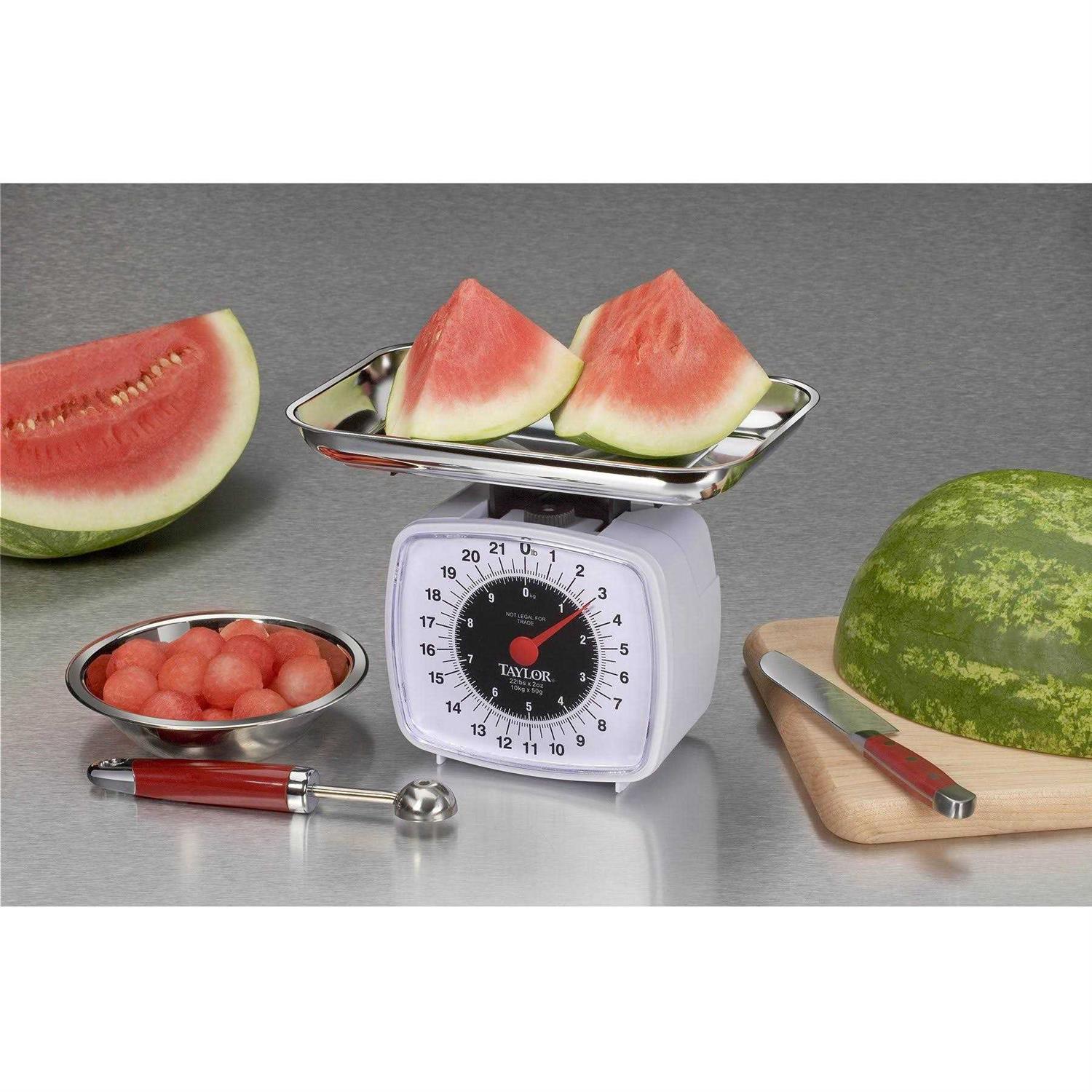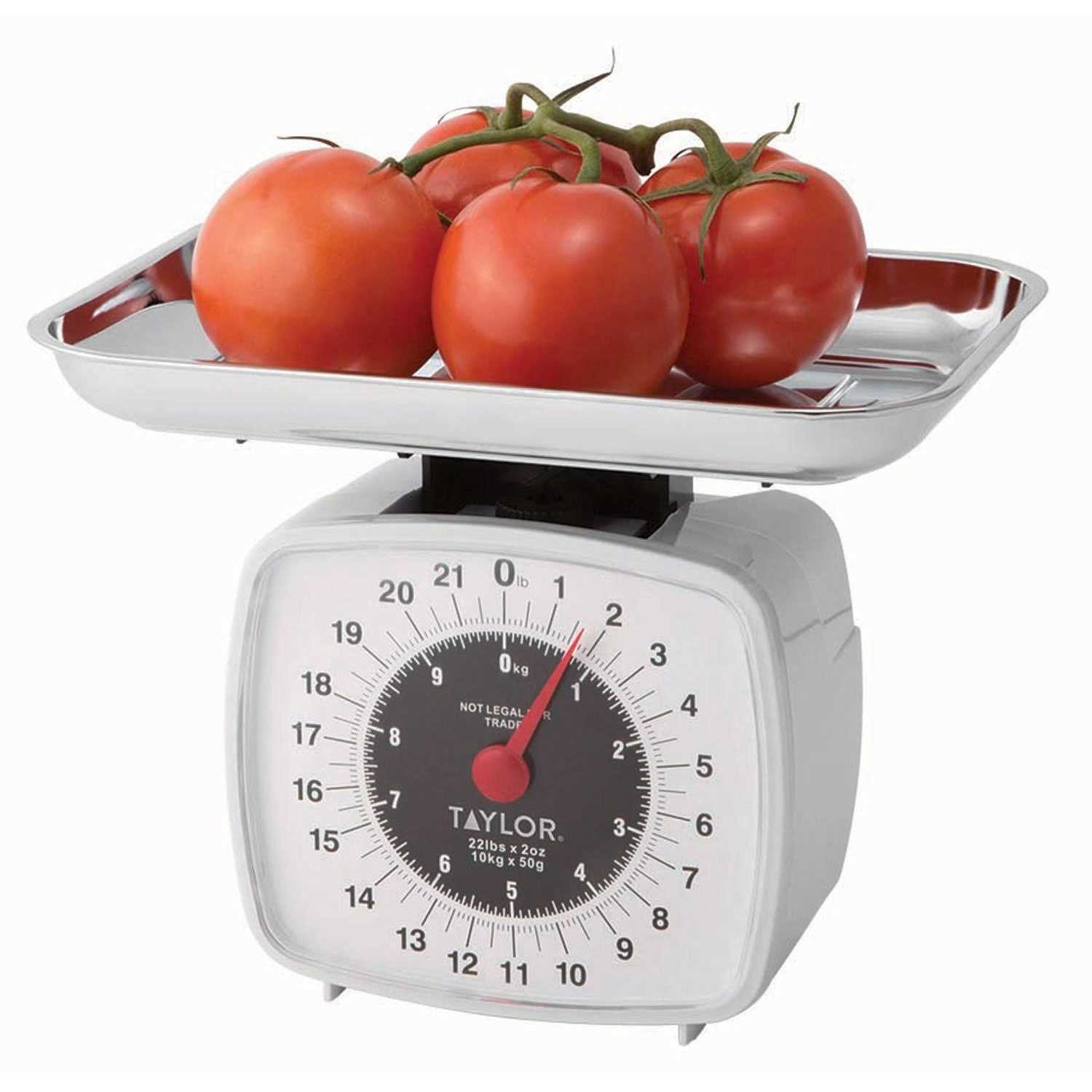Measure the weight of ingredients accurately with this Taylor mechanical food scale. The 22- Lb capacity lets you easily weigh large food items, while bold graphics enhance visibility for added precision. A scratch-resistant clear lens stands up to frequent and long-term use. This easy-to-calibrate Taylor mechanical food scale features a tray with sloped edges to keep small items from falling off and is dishwasher-safe for simple maintenance. Sloped edges on the measuring tray keep small ingredients secure. Holds up to 22 Lbs to accurately measure larger food sizes. Stainless steel build offers long-term use. Sleek, white design provides a neat, clean appearance. Scratch-resistant lens resists abrasions for easy visibility.