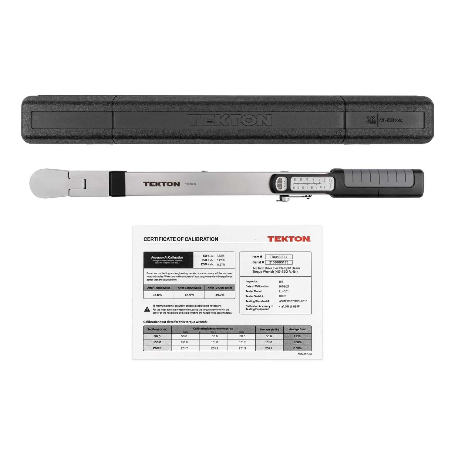 Brand: TEKTONFeatures: Includes 1-pc. 1/2 in. drive torque wrench; Storage case; Product manual with torque conversion chart – Accurate to +-4% throughout the entire 40-250 ft.-lb. torque range – Each torque wrench is serialized and calibrated according to the ASME B107.300-2010 standard and the detailed test results are recorded on the included certificate – A smooth-turning thumbscrew makes it easy to set a precise torque value, while the teeth inside the flip-up cover lock that torque setting in place during use – Unlike other torque wrench designs, this wrench can be stored at any torque setting without losing accuracy – A scale on the body of the wrench allows for quick conversion from foot-pounds to newton-meters – Details: The TEKTON 1/2 Inch Drive Split Beam Torque Wrench is accurate to +-4% throughout its entire 40-250 foot-pound range. Each wrench is serialized and calibrated according to the ASME B107.300-2010 standard. The detailed test results are recorded on the included calibration certificate. Unlike other torque wrench designs, this wrench can be stored at any torque setting without losing accuracy. – UPC: 020209991688Package Dimensions: 74x673x2291