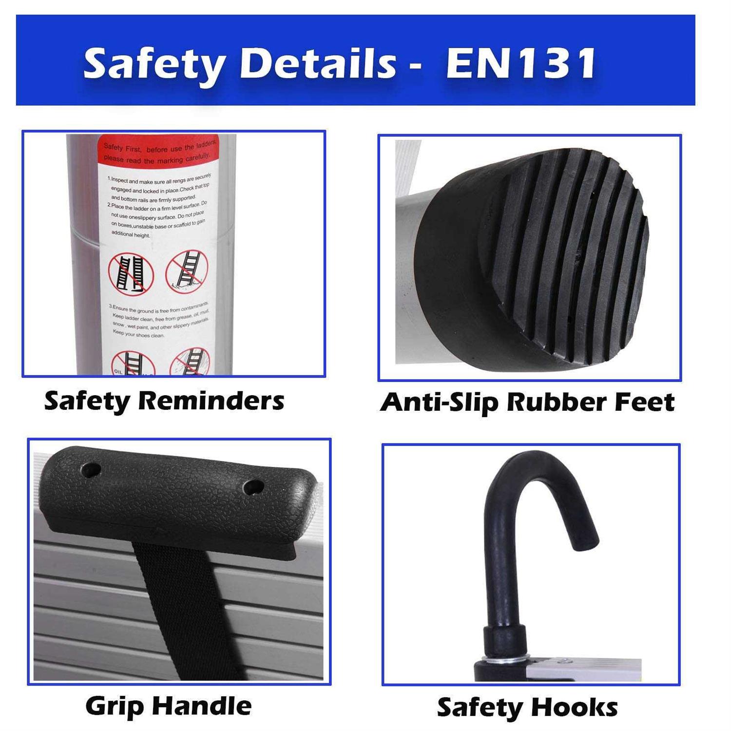 Extension and Retraction Design: Compacting from handy 3ft to 14.5ft. With inward slide latches, you can adjust the height of the ladder rung by rung in 11.8inch increments to fit specific requirement such as repairing ceiling lights, hanging picture frames or painting walls. Safe and Compact: Comes with 2 Hooks for secure fixing. Featuring durable aluminum design, industrial-grade height-locking latches and solid anti-slip rubber-tipped feet on the bottom of ladder step. The telescopic ladder is approved by safety standard EN131. Portable and Convenient: Weight approximates 26.5lbs, 15 steps; folded height of 3ft, it is easy to be stored in car trunks, under beds, or in storage closets. Maximum load capacity: 330lbs(150Kg). Easy to Operate: For extension, start from the top and extend each step fully, then you can hear the “click” sound (confirm both left/right locks are in place); for retraction, start from the bottom and unlock one step by step (Do not put your hand/fingers between the step spacing when it retracts to avoid your fingers being pinched). Multi-purpose Use: Perfect for indoor housework and outdoor activities, window cleaning, changing light bulb, garden work, access loft and much more. This ladder should be part of your tool kit.