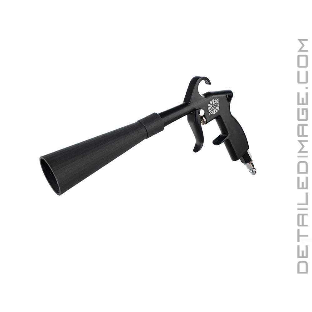 The Rag Company Ultra Air Blaster is a versatile cleaning tool, powered by compressed air! When cleaning interior surfaces, a vacuum works great, but more power is needed to thoroughly clean contamination from certain areas. With the Ulta Air Blaster, the tool will create a mini tornado of air movement, which allows you to easily pull dirt, debris, sand, etc. from carpets, dashboard surfaces, vents, cup holders and more. The standard trumpet fitting works great, but the second fitting adds bristles for agitation and cleaning power. Just screw off the standard fitting and screw on the secondary fitting as needed, switching is that easy! Ultra Air Blaster also works great to blow out and clean microfiber and wool buffing pads during the polishing process. It easily connects with virtually any air compressor (Rag Company recommends a minimum of 20 gallons) and with one simple pull of the trigger you will be amazed at the strong burst of air it provides.