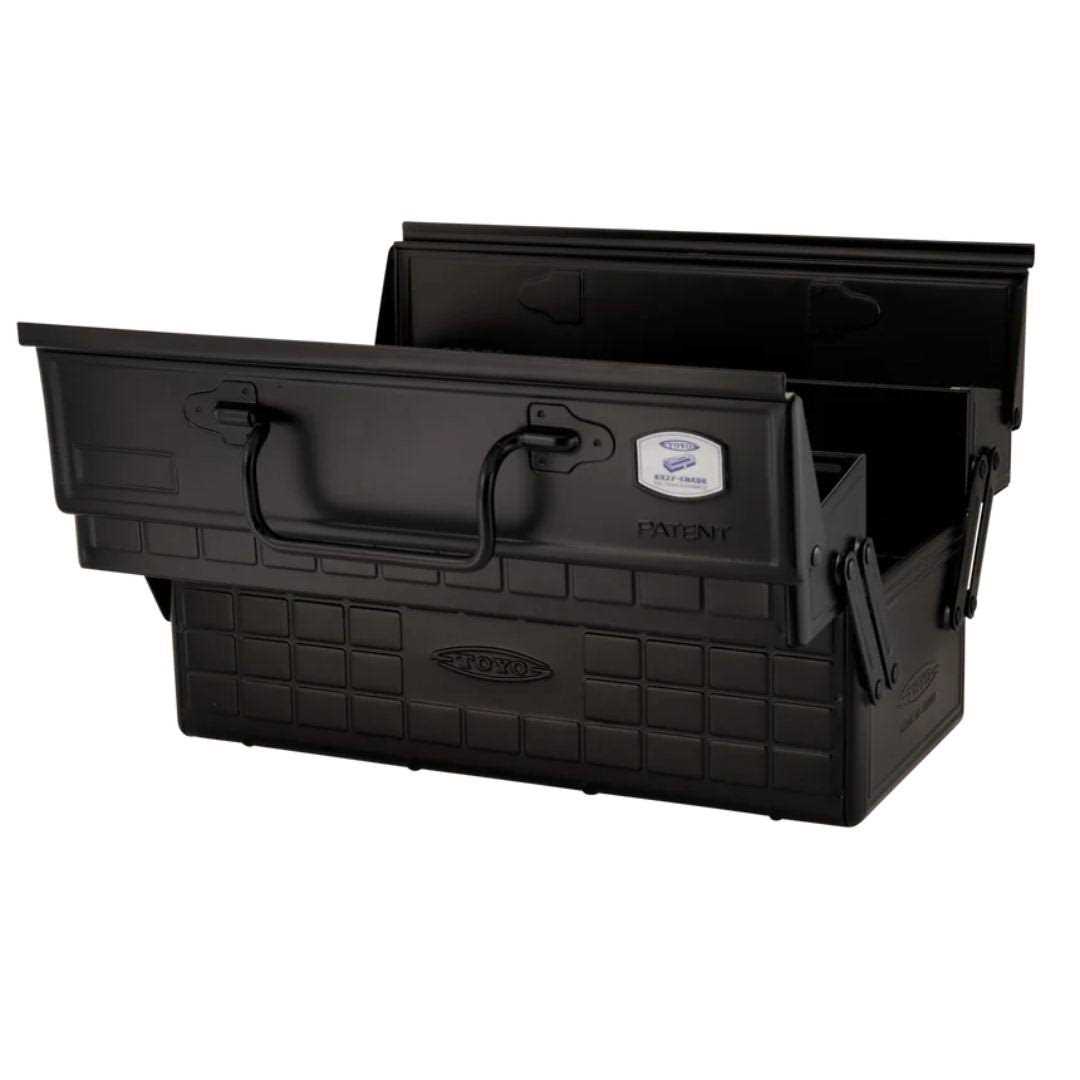 Steel toolbox with cantilever lid, one upper storage tray with adjustable and removable dividers and hole for a padlock. Use for art supplies, make-up, medical supplies, snacks or tea – the possibilities are endless. 13.8” x 6.9” x 8.7”Toyo Steel Company Ltd. was established in 1969 in Osaka, Japan as metal stamping service for the surrounding community. For decades now, Toyo Steel has produced high quality tool and utility boxes as well as other fine steel items for both home and professional use. Their unique process of deep drawing technology involves stamping and folding instead of cutting and seaming, which eliminates sharp edges and creates a more sturdy, lightweight structure.