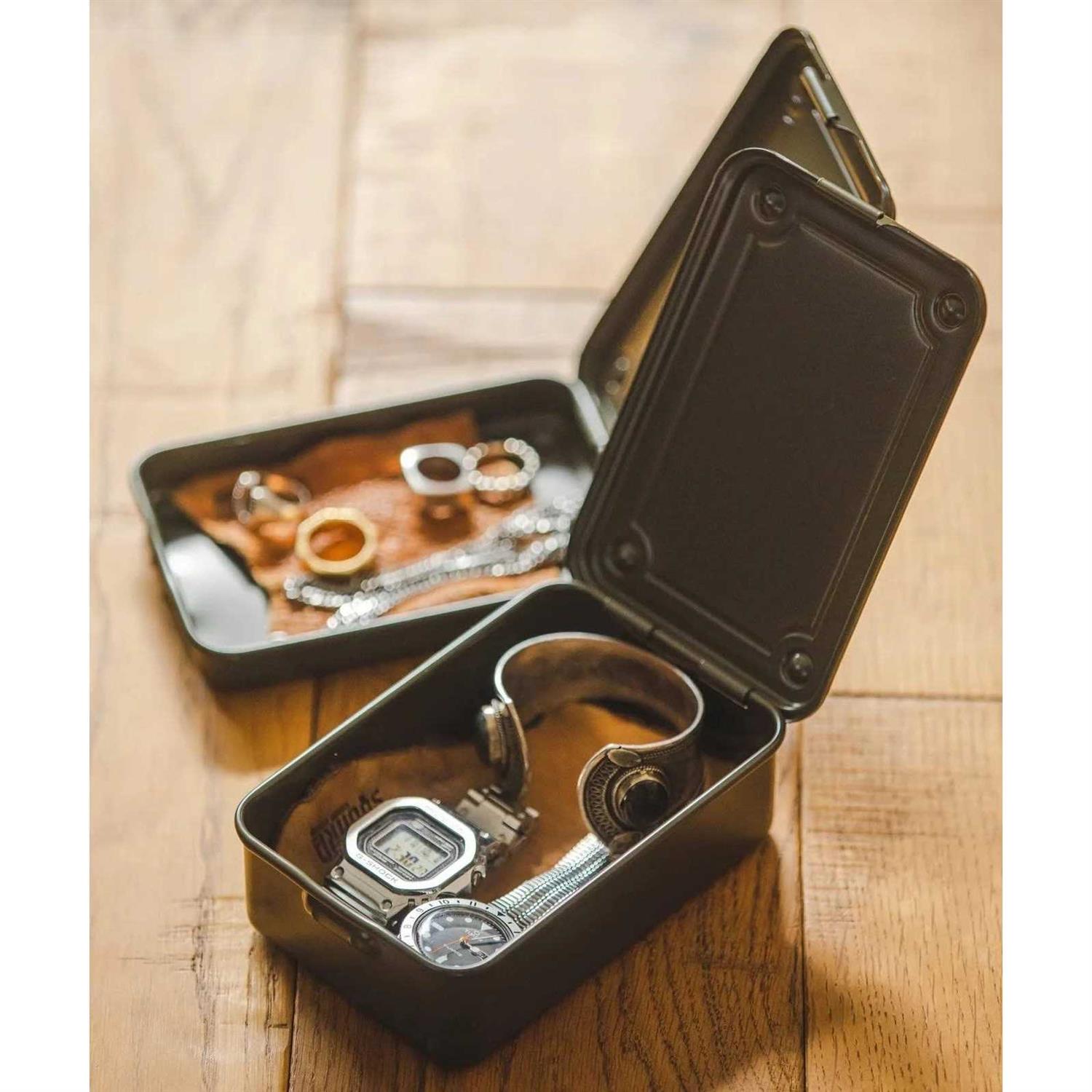 The Toyo Steel Black Stackable Storage Box is designed with organization in mind. Made in Japan since 1969, this container makes use of Toyo’s innovative technology developed to make a completely seamless toolbox. It features a flat, hinged lid constructed from a single piece of steel, eliminating sharp edges while maintaining rugged durability. Its matte black factory baked finish is lightly textured and features four feet formed into the bottom with corresponding lid divots for secure stacking. The 6-inch size and lightweight yet durable construction make it useful for containing smaller items throughout the house, garage or on the go. Factory baked painted steel with a lightly textured matte finish. Dimensions: 6″ W x 4″ D x 2″ H. Made in Japan. Care Instructions: Wipe with a soft cloth. Stackable – Four pressed feet in the bottom with corresponding divets on lid help keep them stacked in place. Hinged lid.