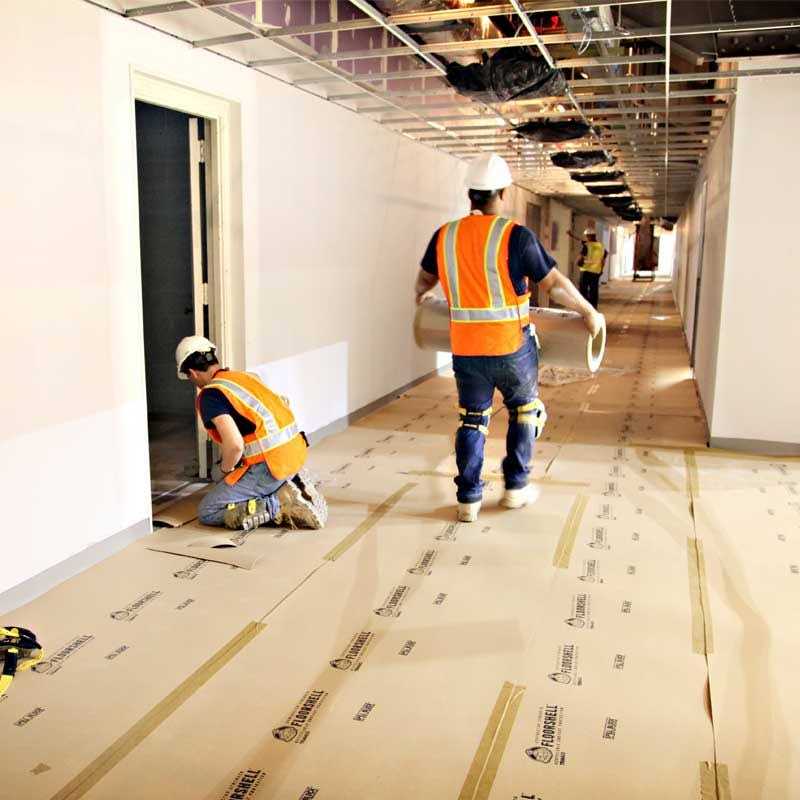 FloorShell is a contractor strength floor protection roll for your toughest jobs. Heavy-duty construction board made from 100% recycled fibers this item is eco-friendly and reusable. FloorShell protects wood concrete stone tile linoleum epoxy vinyl composition tile VCT and most other floor types. The 45 mil thick board can even stand up against the wear and tear of forklifts. Worried about spills our new innovative Spill Block liquid repellent technology protects against paint mud water and more. Our scored edge provides protection for baseboards walls and can even be used to contain debris to the aisle. Breathable to allow curing of floors. Breathable to allow curing of floors. 4X thicker than red rosin paper. Works great with our FloorShell seam tape.