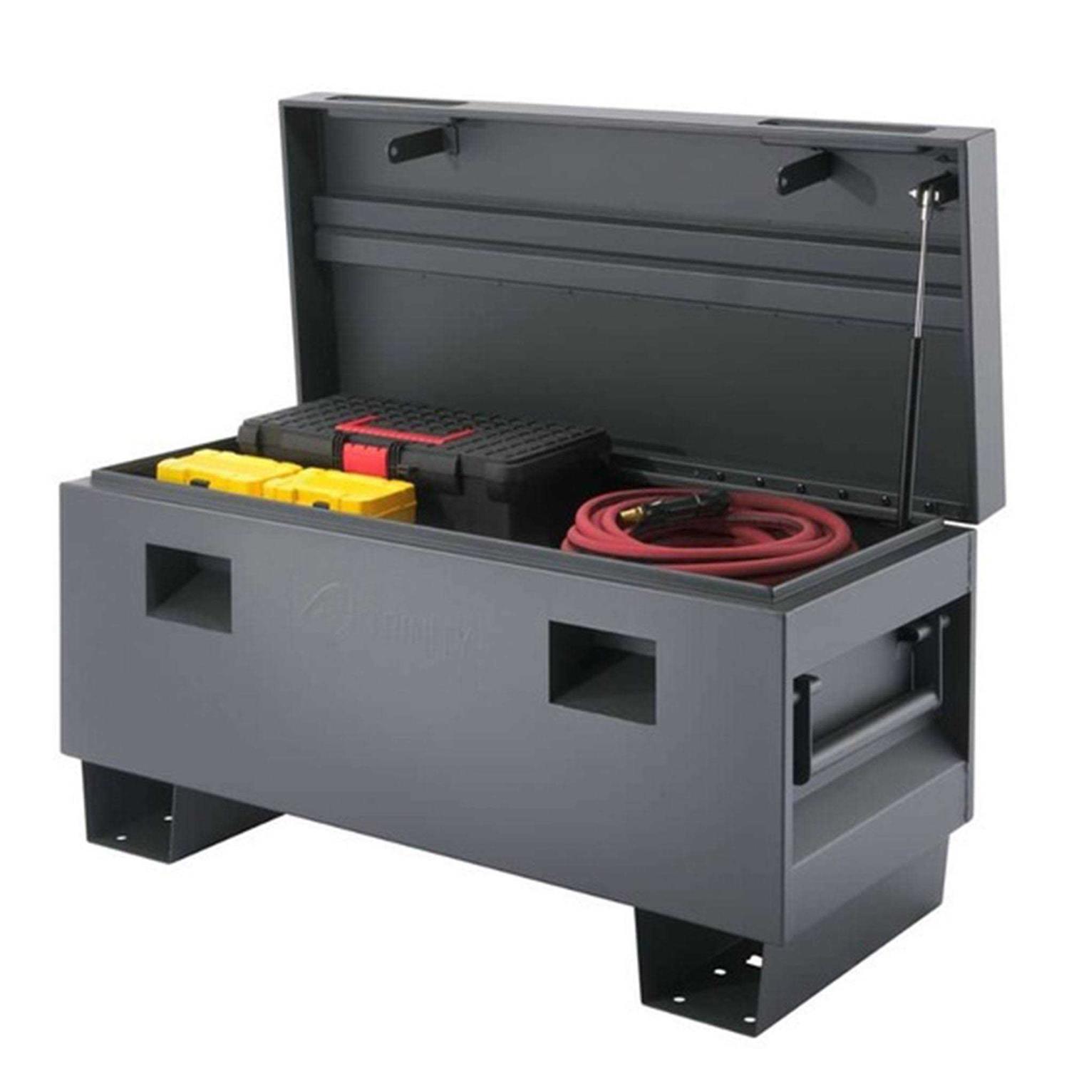 When you’re on the clock, you’ll want all your essential tools. Store everything you need for a job well done with the Trinity Basics 36 Inch Indoor/Outdoor Job Site Box. This job site box is designed for professionals who value quality and remarkable craftsmanship. Made from 1.5-millimeter thick steel with a matte powder-coated finish that withstands rust, this box can be stored outdoors for an extended period of time. The raised lip and overlapping lid provide protection against the elements and a tighter fit for added security. 4 pre-drilled holes on each corner of the base are easily accessible, allowing the box to be bolted to an open surface. Whether mounted to a truck bed or job site, this box will always be within range, and is forklift and crane accessible. Keep unwanted users out with a tamper-proof locking system that keeps your items safe and sound. When you’re finished working, recessed carrying handles allow you to transport this box from place to place with ease. Always show up prepared with the right tools for the job with the Trinity Basics 36 Inch Indoor/Outdoor Job Site Box.
