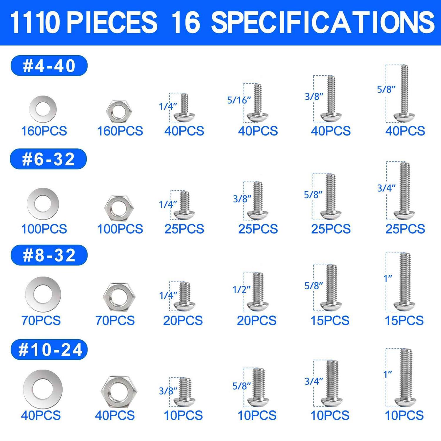Trollug 1110PCS Nuts and Bolts Assortment Kit Stainless Steel Hardware Assortment Kit with Assorted Screws Nuts Bolts and Washers#4-40#6-32#8-32#10-24