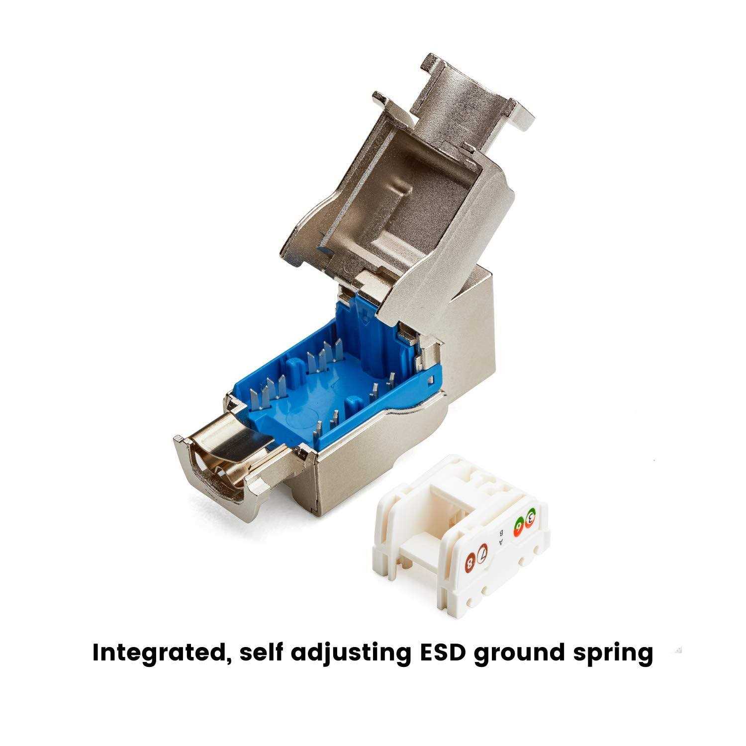 MAXIMUM PERFORMANCE. Component level rated. Suitable for 10 Gigabit (10/100/1000/10000 Mb/s) up to 328 feet. Compatible with 23 to 26 AWG solid or stranded copper conductors. Supports PoE/PoE+/PoE++ (IEEE 802.3af/at/bt) 4PPoE up to 100W. Tested up to 500 MHz. Self adjusting spring in the strain relief neck assures the cable shield is in contact with the metal housing. EASY TO USE. Self terminating means no more punch down tools required. Our 90 degree tool less design provides maximum snap-shut confidence. The dual level termination cap is marked with highly visible colors for easy T568A or T568B wiring and helps keep conductor pairs separate. VERSATILE. 100% compatible with any standard wall plate or patch panel. Ultra durable metal construction. Integrated full circumference strain relief neck provides additional termination protection from conductor stress pre and post installation. No more ruined terminations due to handling. Compatible with our trueCLOSE keystone jack closure tool and F/UTP Ethernet cables. QUALITY GUARANTEED. ANSI/TIA 568 2. D Certified by trueCABLE. UL Listed, TAA compliant, ETL Verified, RoHS-2 compliant. Tested in the real world by real installers. 12 PIECE BOX. Each keystone includes a dual-level termination cap, nylon tie, along with full instructions on how to terminate. These durable and time saving component level keystone jacks are sure to make your install hassle-free. trueCABLE “component grade” toolless keystone jacks are truly professional grade. Most other keystones on the market are “channel grade”. What does this mean? It comes down to performance and durability. Component level keystone jacks are guaranteed to meet and exceed the Category stamped on them. The construction is fused into one piece, ensuring stability during termination. This process is called “press fit”. It eliminates additional electrical traces needed to mate the printed circuit board inside with the RJ45 female connection contacts. The net result is increased performance due to less cross talk. Most keystone jacks on the market are actually several components snapped together, and that is where the trouble can start. Not with ours. The IDC cap increases your productivity while our dual level design helps separate the pairs logically for easier and faster terminations. Two pairs “go low” and two pairs “go high”. This allows for tighter terminations that would otherwise not be possible with standard toolless keystone jacks. Cable headroom performance increases when terminations are tighter. The least amount of untwist is ideal. Our toolless jacks include a strain relief neck and nylon tie to make tighter cable bends possible without putting undue strain on your termination. Snap it shut, tie it down, and call it a day. Treat yourself. Buy the “real deal” and stop worrying about the quality of your components. Less stress, less hassle, and less ladder time for you.