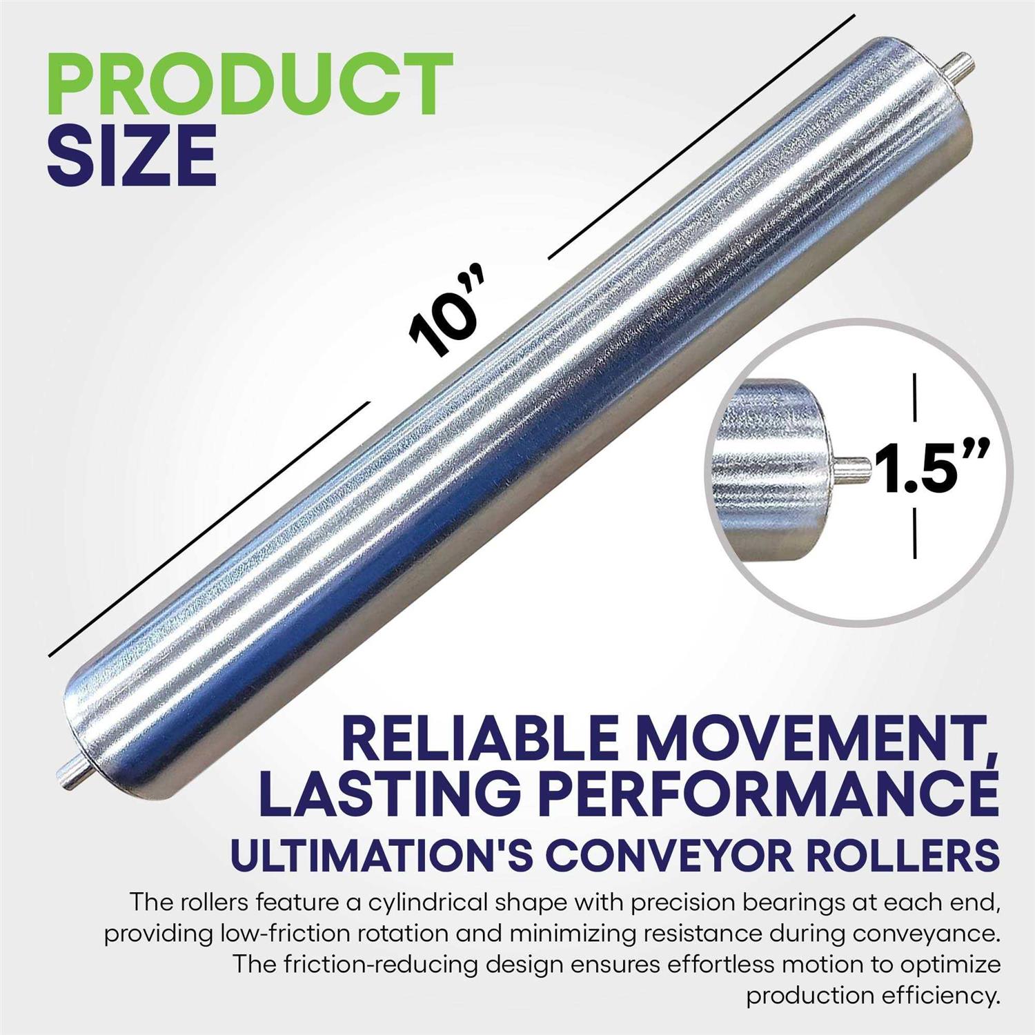 Galvanized Steel Rollers for Efficient Material Handling: Our Ultimation Conveyor Rollers boast a sturdy 18-gauge galvanized steel tube construction, ensuring long-lasting performance in demanding conveyor systems. Experience smooth and reliable movement without compromising on quality. PRECISION-MADE 1.5″ Diameter Steel Rollers with Spring-Retained Axle: Each roller features a 1.5″ overall diameter, precisely designed for optimal functionality. The 1/4″ diameter mild steel axle, with a 22.6″ long shaft, is spring-retained for easy assembly. No more hassles – simply push the spring in or pull from the other side to fit the roller into the conveyor frame effortlessly. 36-POUND LOAD CAPACITY: Our rollers are engineered to handle loads with ease, boasting a 36-pound max. load capacity per roller. Need to handle more weight? No problem! Place rollers at closer spacing, and our rollers will tackle the task without compromising efficiency. VERSATILE COMPATIBILITY with 24″ Overall Width Gravity Conveyors: Designed to fit seamlessly with any 24″ overall width gravity conveyor utilizing 1/4″ round axles. UNMATCHED VALUE and VARIETY: Ultimation’s steel conveyor rollers are a cost-effective solution for your material handling needs. Available in various roller center options of 3″, 4-1/2″, or 6″ between rollers, and widths of 12″, 15″, 18″, 24″, 30″, 36″, and wider. Choose from roller diameters of 1.5″, 1.9″, 2.5″ (heavy-duty), or 3.5″ (extreme-duty), and enjoy the versatility of steel or aluminum frames. Experience top-quality products that excel without compromise. Weight per roller: 4.25 pounds Introducing Ultimation Conveyor Rollers – Your Reliable Solution for Efficient Material Handling! Crafted with Durable 18 Ga. Galvanized Steel, our rollers are built to withstand the rigors of demanding conveyor systems, ensuring long-lasting performance. Experience seamless and smooth movement without any compromise on quality. Each Precision-Made Roller features a 1.5″ Diameter, meticulously designed for optimal functionality. The Spring-Retained Axle, with a 1/4″ diameter mild steel axle and a 22.6″ long shaft, ensures effortless assembly – just push or pull the spring to fit the roller into the conveyor frame hassle-free. With an impressive 36-pound Load Capacity per roller, you can confidently handle heavy loads. Need more capacity? No worries! Our rollers adapt effortlessly when placed closer together, ensuring maximum efficiency. Versatility meets Convenience with our Rollers’ compatibility with 24″ Overall Width Gravity Conveyors using 1/4″ round axles. Get Unmatched Value and Variety with Ultimation’s steel conveyor rollers. Available in multiple roller center options and widths, you can select the perfect fit for your specific needs. Choose from roller diameters, including 1.5″, 1.9″, 2.5″ (heavy-duty), or 3.5″ (extreme-duty), and enjoy the flexibility of steel or aluminum frames. Experience top-quality products that excel without compromise, designed to carry a maximum weight of 36 pounds per roller. Invest in Ultimation Conveyor Rollers today and streamline your material handling process with confidence!