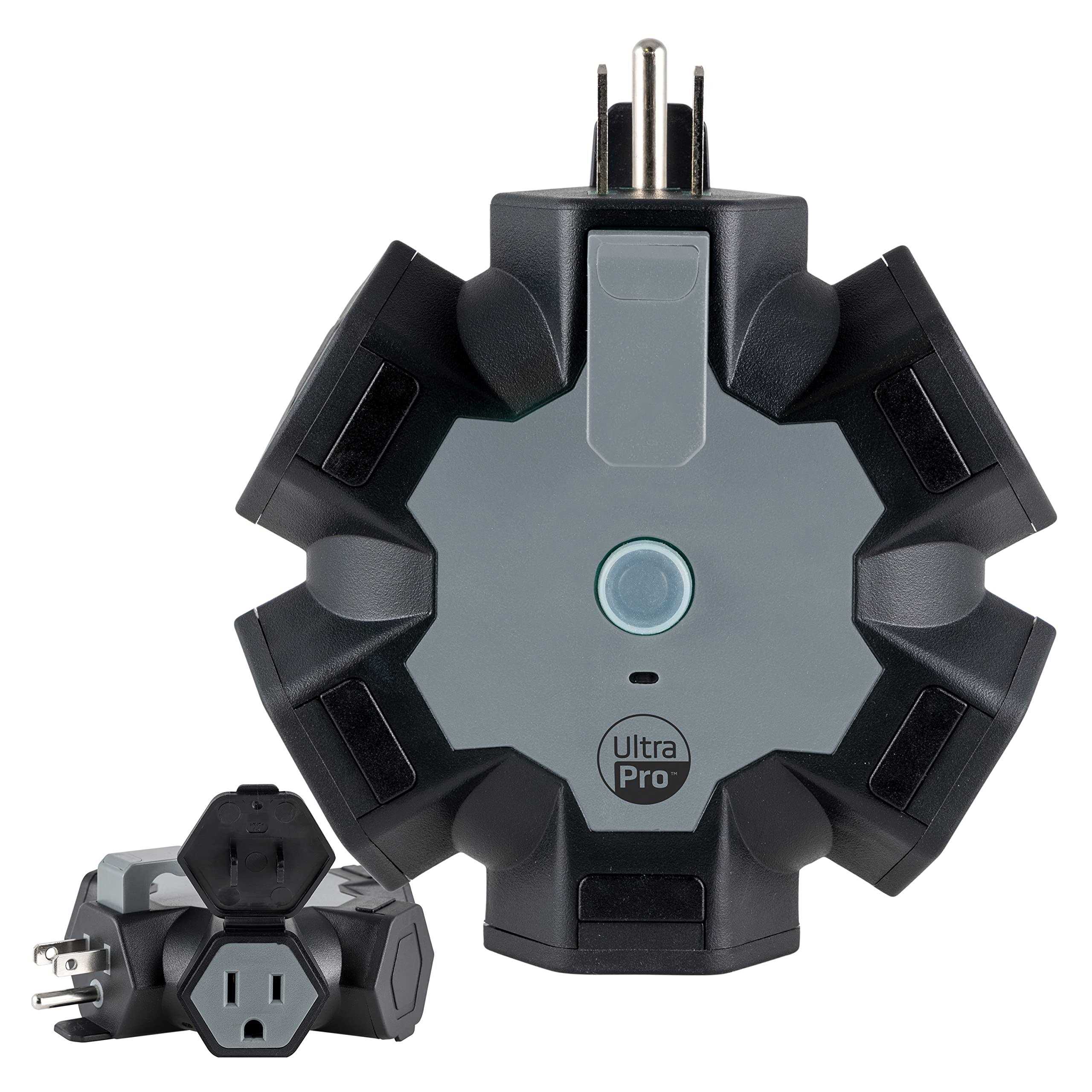 Add outlets where you need them most with an UltraPro 5-Outlet Extension Cord Adapter. Featuring five grounded AC outlets this charging station is safe for use outdoors to power landscape lights seasonal lighting and decorations tools appliances and more. Indoors the gray finish easily integrates into any décor to ensure your extension cord adapter doesn’t become a distraction. Transform your regular three-prong extension cord into a safe multipurpose power hub for laptops tablets smartphones and other mobile devices. The hexagonal design of the plug-in hub provides easy access to bulky plugs and chargers. Featuring an integrated circuit breaker for overload protection and a handy reset switch you can rest assured that your electronics are protected from damaging overload conditions. Check the status of your connected equipment with the power indicator light. Twist-to-close safety covers rotate to restrict outlet usage and prevent the insertion of foreign objects. The ergonomic hook ensures a secure grip while the built-in baseplate enables safe connections. Wrap the end of your extension cord around the handle to keep it from being disconnected while in use. Organize your entertainment with the UltraPro 5-Outlet Extension Cord Adapter.
