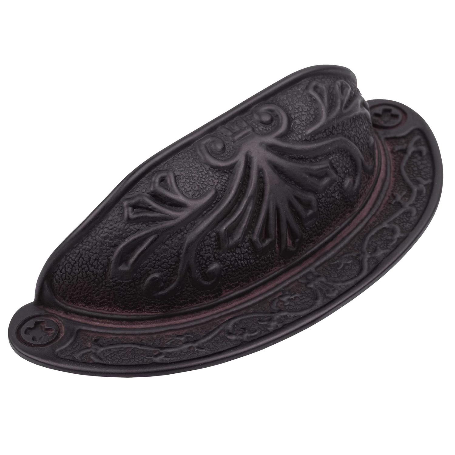 Dimensions: 2 1/2″ approx. – Centers; 1 1/2″ High x 4″ Wide; 1 1/8″ Projection. This cup pull with a scrolled pattern is made of die cast zinc with an oil rubbed bronze finish applied. Its sturdy construction and traditional design make this hardware a good fit when you need a stylish and robust drawer pull. The package contains one / six / ten drawer bin pulls with mounting hardware. This Baroque cup pull is easy to install and gives a vintage look to your furniture piece. It perfectly complements an antique dresser, cabinet, armoire, bedside table, desk, and more. Our handles are a nice feature for completing an antique restoration or woodworking project. Using these pulls on kitchen or bedroom furniture can also add a vintage touch to modern home decor.