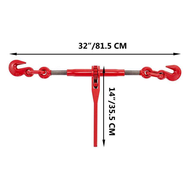 13,000 lbs Secure Working Load: The chain load binder has an excellent loading capacity of 9215 lbs. Breaking Strength: 33,069 lbs. Fitting your 3/8-inch to 1/2-inch chains, this is built for most industrial jobs. All-Steel Construction: The heavy-duty steel construction is intended to stand up to the rigorous field and harsh climate conditions. The red powder-coated finish ensures maximum durability and longevity. Convenient To Use: The ratchet binder provides two G70 hooks on both ends to work with your chains. Manually adjust the width between the two hooks from 25”-32”. User-friendly Designs: Our chain binder features a 14” long handle, which provides extra leverage, so you can control it to get the proper amount of tension. Especially, the ratcheting gear and pawl design prevent dangers to you when loading and unloading. Multifunctional Tool: Our ratchet load binder is perfect for securing heavy loads to a truck or flatbed trailer. It is also suitable for tying down, logging, and towing cargos for most industrial applications such as factories, warehouses, garages, docks, etc.
