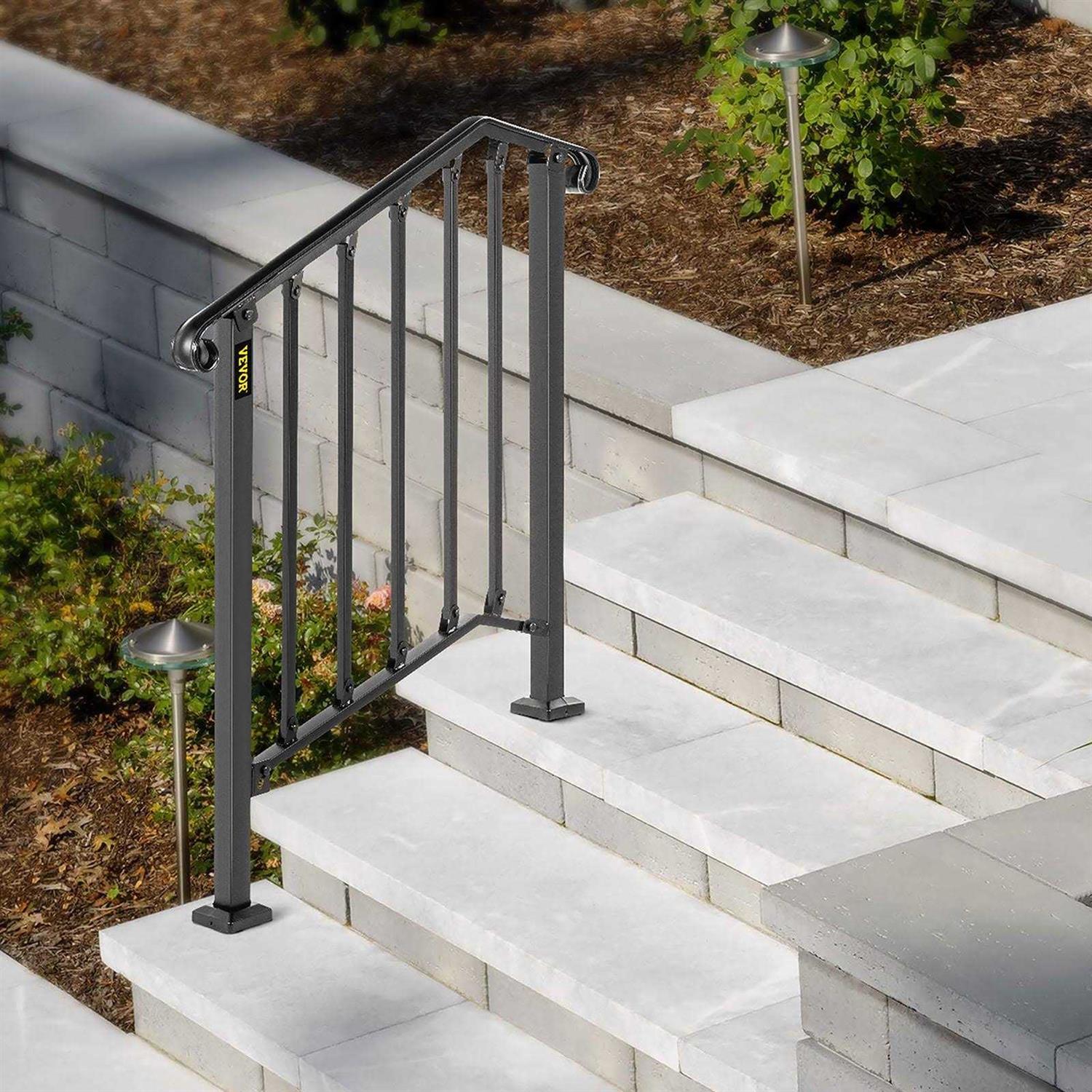 2-3 Steps Wrought Iron Handrail: Our outdoor stair railing for concrete provides extra protection for the elderly, children, and disabled struggling to use stairs; The flexible height allows the exterior handrail for steps to fit 2 or 3 stairs, meeting your different needs; With sturdy wrought iron material and powder-coated surface, the railing is rustproof and easy to clean; This metal handrail for outdoor steps is ideal for gardens, residential buildings, porches, hotels, etc; Flexible for 2 or 3 Steps; Sturdy Wrought Iron; Effortless Installation; Stylish and Delicate Design; [Package Content] 1 x Handrail; 10 x M6 Bolts; 4 x M8 Bolts; 8 x Self-Tapping Screws; 8 x Expansion Screws; 2 x Open-Ended Spanners; 24 x Gaskets(A 10mm thick fine drill can be used to drill holes with a depth of 9-10cm; Silver screws are installed on wooden floors and iron plates; Black expansion screws are installed on cement floors) VEVOR Handrails Stair Railing 28-in x 2.4-in x 38.5-in Black Steel Deck Stair Rail Kit | LTFS2H3BHSTL00001V0