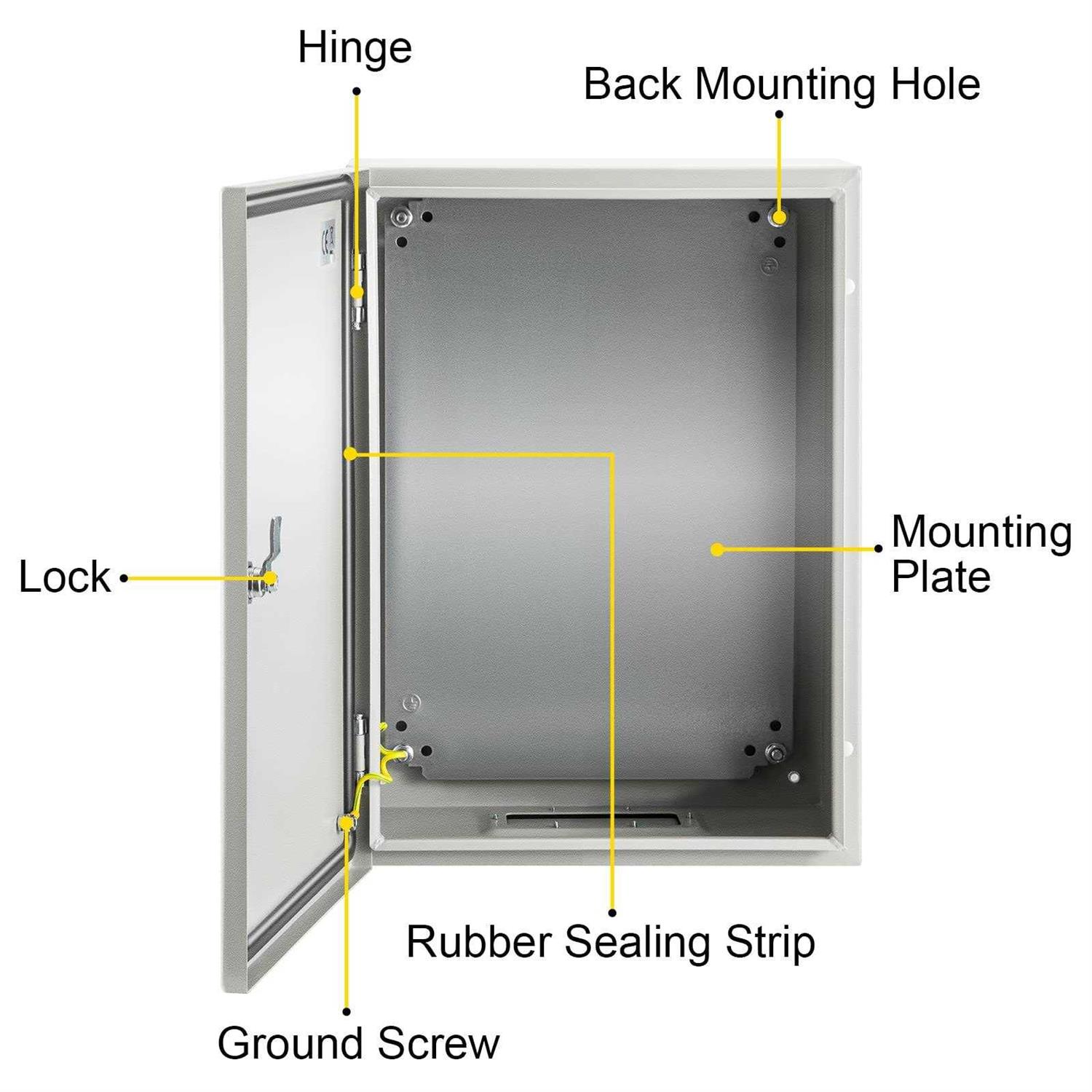 【STURDY CONSTRUCTION】- The electrical enclosure adopts professional carbon steel made by precise cutting and welding. It has stronger wear resistance and can prevent rain erosion—the epoxy polyester powder coating for good mechanical properties and leveling property. 【REINFORCED LOCK & HINGE】- The electronic equipment enclosure box features a high-quality lock core with a reliable precision structure that is not easy to fall off. The high-strength hinge is applied to ensure that the box door is not easily damaged or broken by extrusion. 【WATERPROOF SEALING STRIP】- The hinged junction box is sealed with rubber strips to prevent rainwater from entering and protecting internal electrical safety. The steel electrical box is built with an IP65 protection class and earthing screw to ensure electrical safety and product safety. 【CONVENIENT INSTALLATION】- The metal enclosure box is equipped with a removable galvanized mounting backplate to facilitate installing the electrical components. Complete accessories and four wall mounting holes in the back make it easy to fix the wall’s electrical box. 【EXTENSIVE USE】- Steel electrical box is suitable for indoor and outdoor applications to protect circuits and prevent corrosion. It is ideal for industrial equipment and medical devices, such as factories, construction sites, malls, squares, residential areas, courtyards, etc.