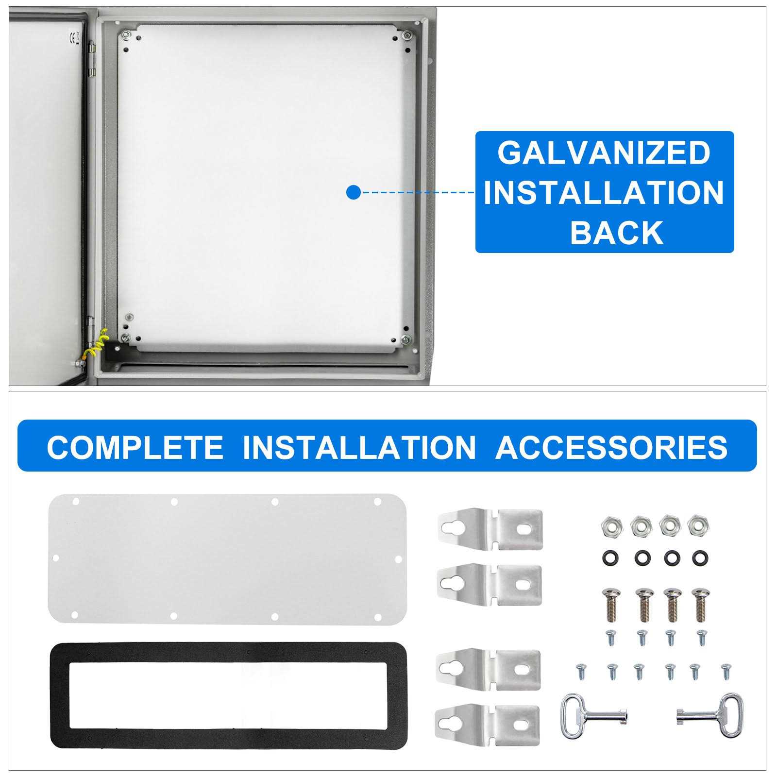VEVOR Steel Electrical Box Electrical Enclosure Box 24x24x12 Carbon Steel IP65 DQXJSTCFS60X60X30V0 650971614876 Electrical Enclosure Box–Begin your safety setups IP66 Grade & High Security & DIY Projects The electric enclosure box is made of high-quality carbon steel. Precise lock design high-strength hinges sealing strips and IP66 protection grade are all used to protect your plug-ins power cords and other equipment from the influence of the weather. Therefore to ensure the circui…
