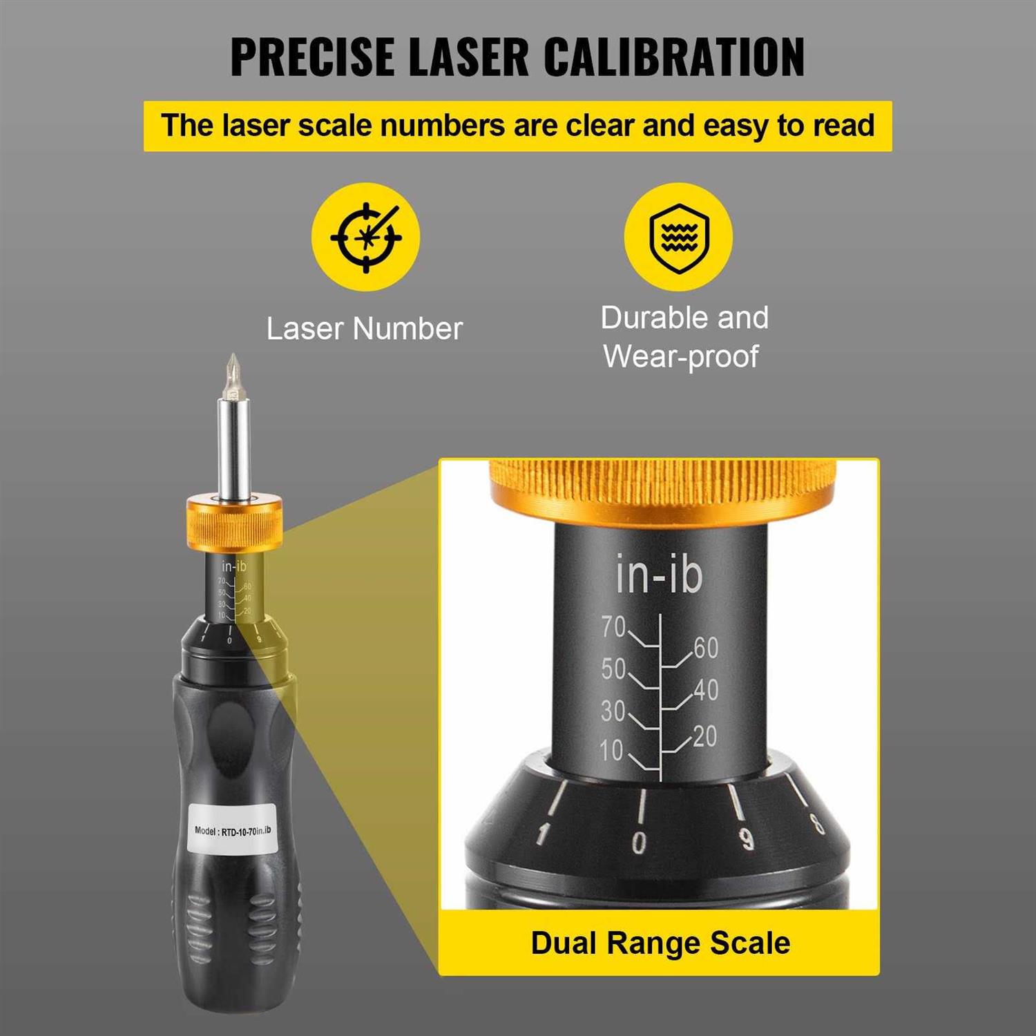 VEVOR Torque Screwdriver 14 Torque Screwdriver Electrician 10-70 inlbs Torque Range Accurate to 5% NJQZBDDWC10-7ZNKCV0 614198630262 10-70 inlb Torque Screwdriver This adjustable torque screwdriver with multiple bits is an ideal tool in electrical light industry machinery manufacturing scientific research structure. It features a 10-70 in-lbs torque measurement range 14 inch driver 5% accuracy range 1 in-lb increment. Sturdy steel and rubber material provide an extended use t…